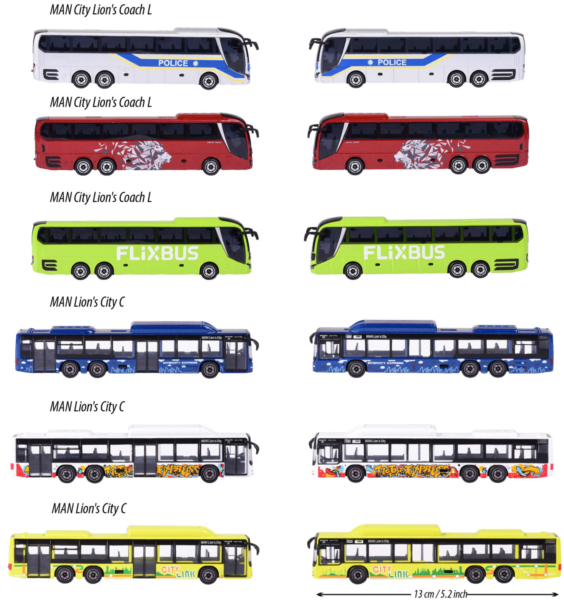 Descubre el modelo detallado del autobús MAN Lion's City C de la serie Majorette Trailer, que encantará tanto a los pequeños conductores como a los coleccionistas entusiastas. Su diseño realista, materiales de calidad y el movimiento fluido de las ruedas convierten a este modelo en el juguete ideal para el juego diario y para exhibir.