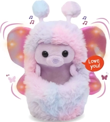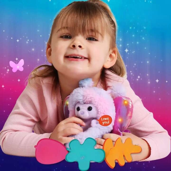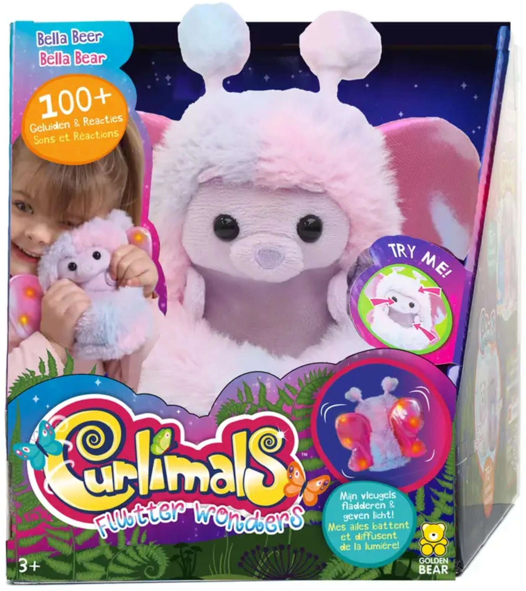 El adorable osito de peluche Bella de la serie Curlimals Flutter Wonders de la marca Golden Bear encantará a los niños con su pelaje suave, alitas luminosas y más de 45 sonidos. Responde al tacto en la barriguita, las caricias y los toques en la nariz, sabe reír, enviar besitos y dice frases adorables. Su tamaño compacto de 18 cm es ideal para jugar y acurrucarse.