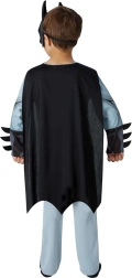 El estampado de músculos, el emblema del murciélago en el pecho y el “utility belt” amarillo aportan un look realista que encanta a los niños.