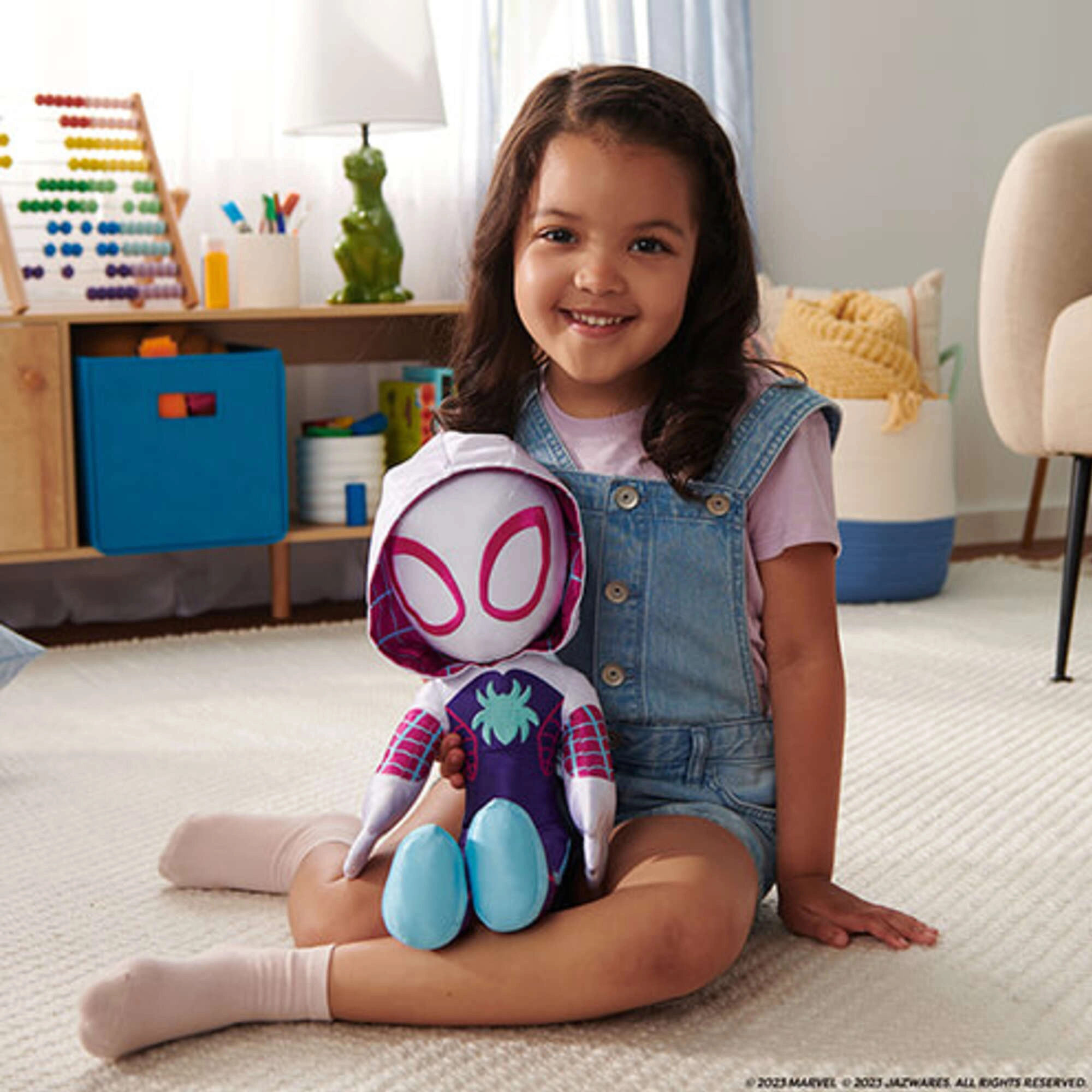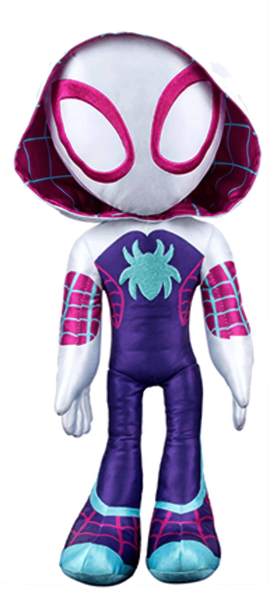 La heroína favorita Ghost-Spider (Gwen Stacy) llega en forma de peluche suave de la serie Spidey y sus sorprendentes amigos. Gracias a su fabricación de calidad con detalles faciales bordados y su característico traje blanco con acentos rosa y azul, es perfectamente reconocible y está lista para el juego y los mimos del día a día.