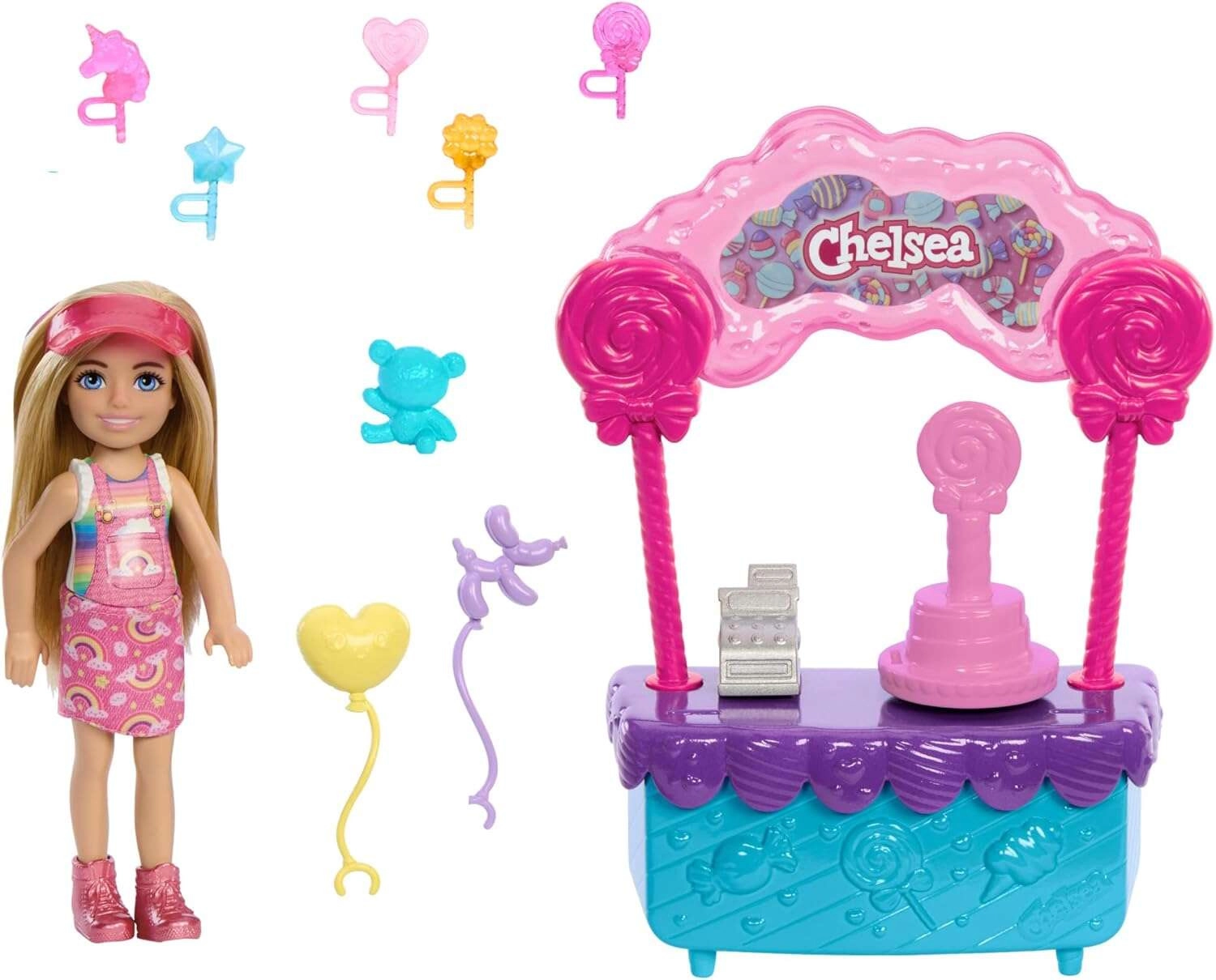 Descubre el dulce mundo con la muñeca CHELSEA de BARBIE: el colorido puesto de piruletas aporta mucha diversión creativa de juego de roles. Incluye una muñeca de aprox. 15 cm con vestido rosa con arcoíris, un puesto con caja registradora, base giratoria para tarta, decoraciones de piruletas y pequeños accesorios para vender y servir dulces. Regalo ideal para niños a partir de 3 años.