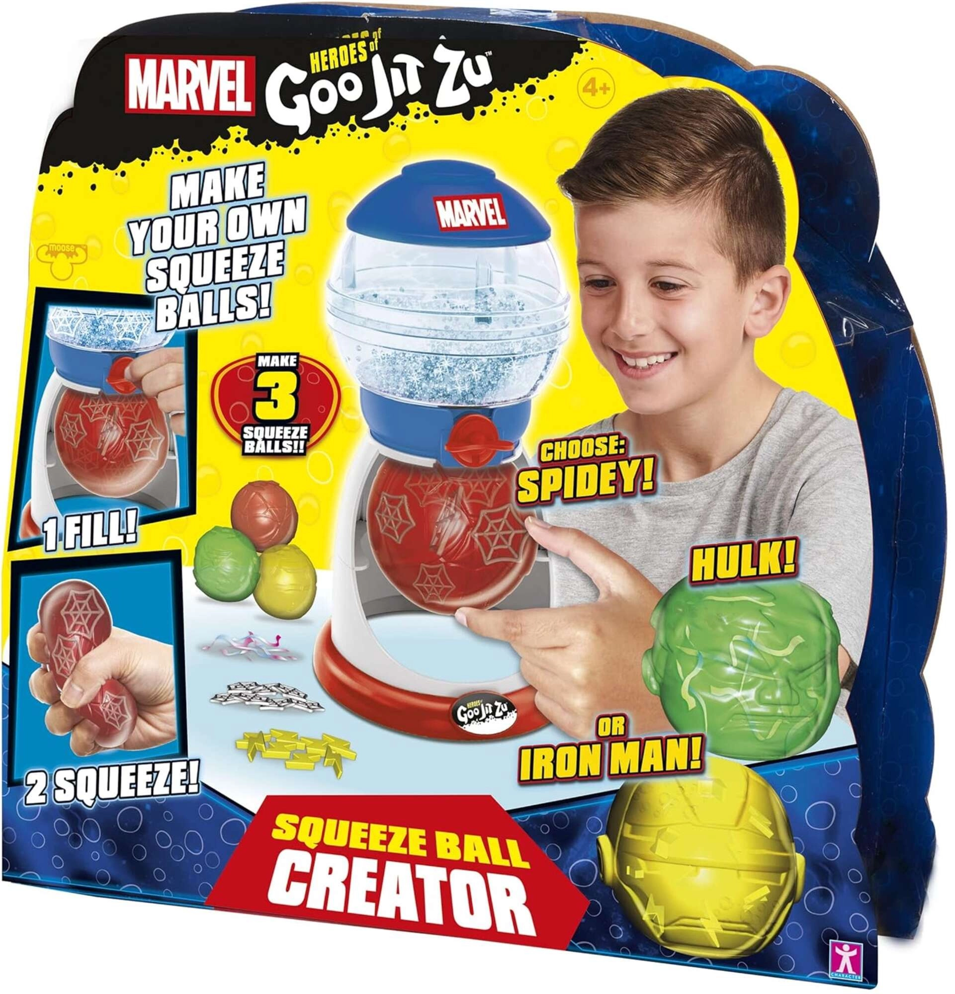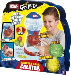 Tres pelotas en colores inspirados en Spider-Man, Hulk e Iron Man con motivos en relieve. Mezcla purpurina y accesorios para crear efectos squishy originales.