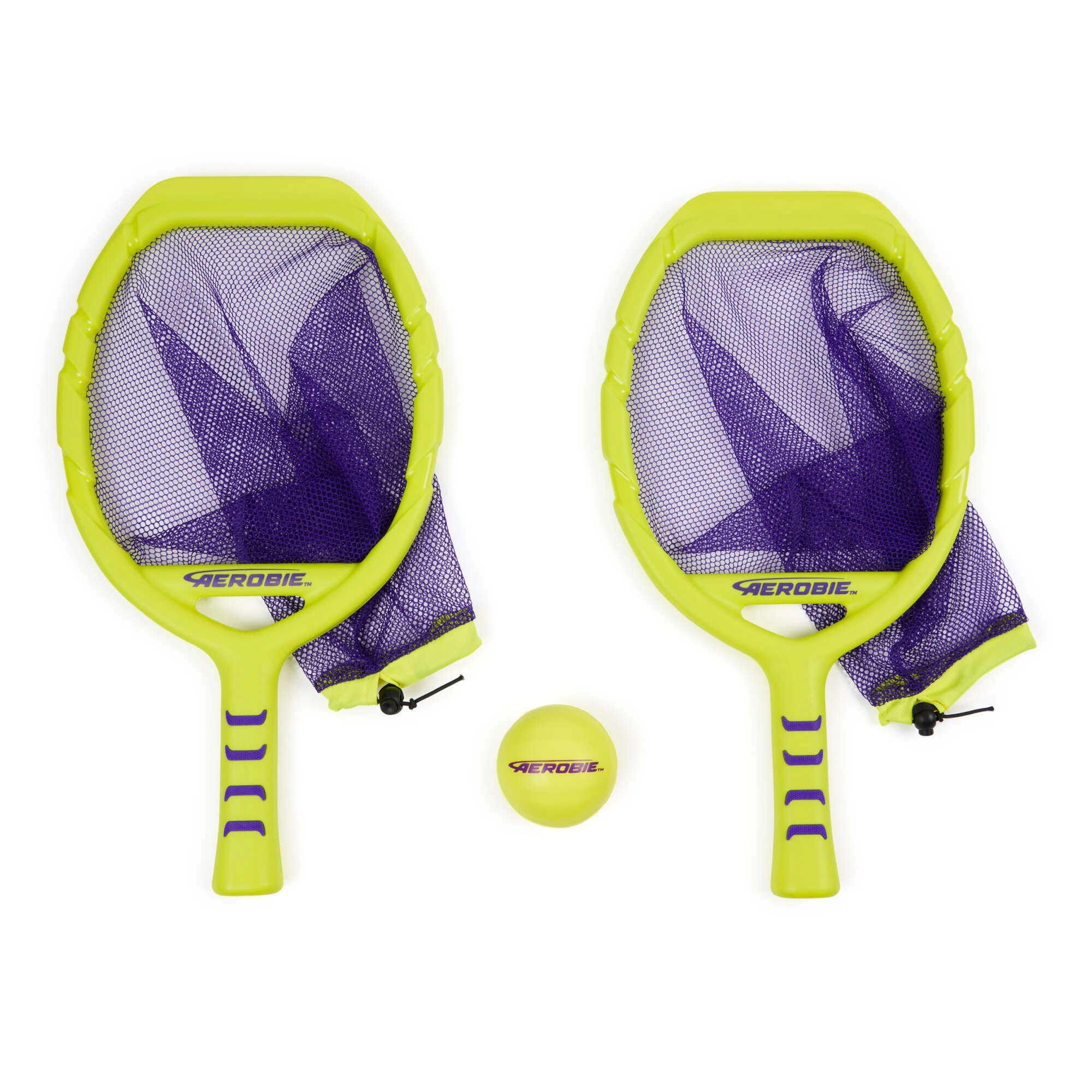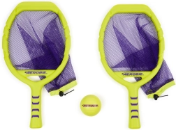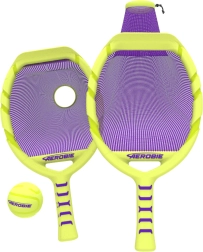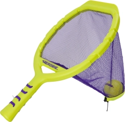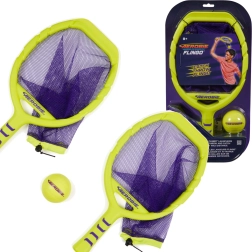 Dos raquetas en color amarillo neón con red morada y una pelota a juego crean un set llamativo y fácil de ver para momentos activos en familia, duelos amistosos y entrenamiento de agilidad y coordinación. Diversión sin pausas: la red ayuda a recoger la pelota fácilmente del suelo y seguir jugando.