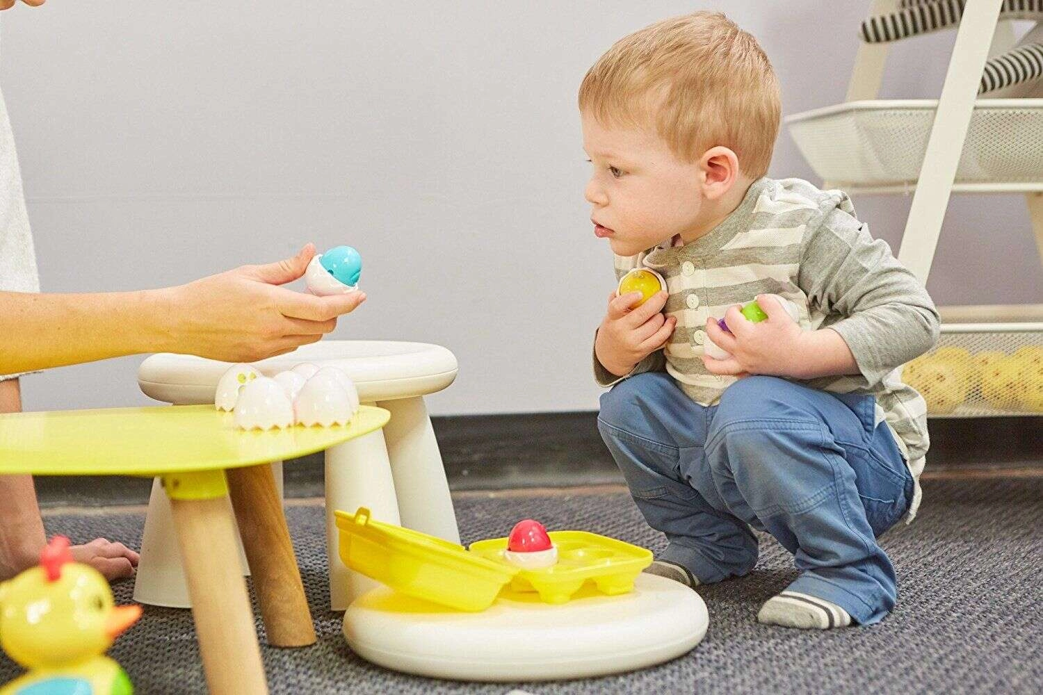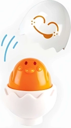 Los pollitos de colores dentro de los huevos chirrían al presionarlos. Así, el niño desarrolla de forma natural el oído, el tacto y la comprensión de causa y efecto.