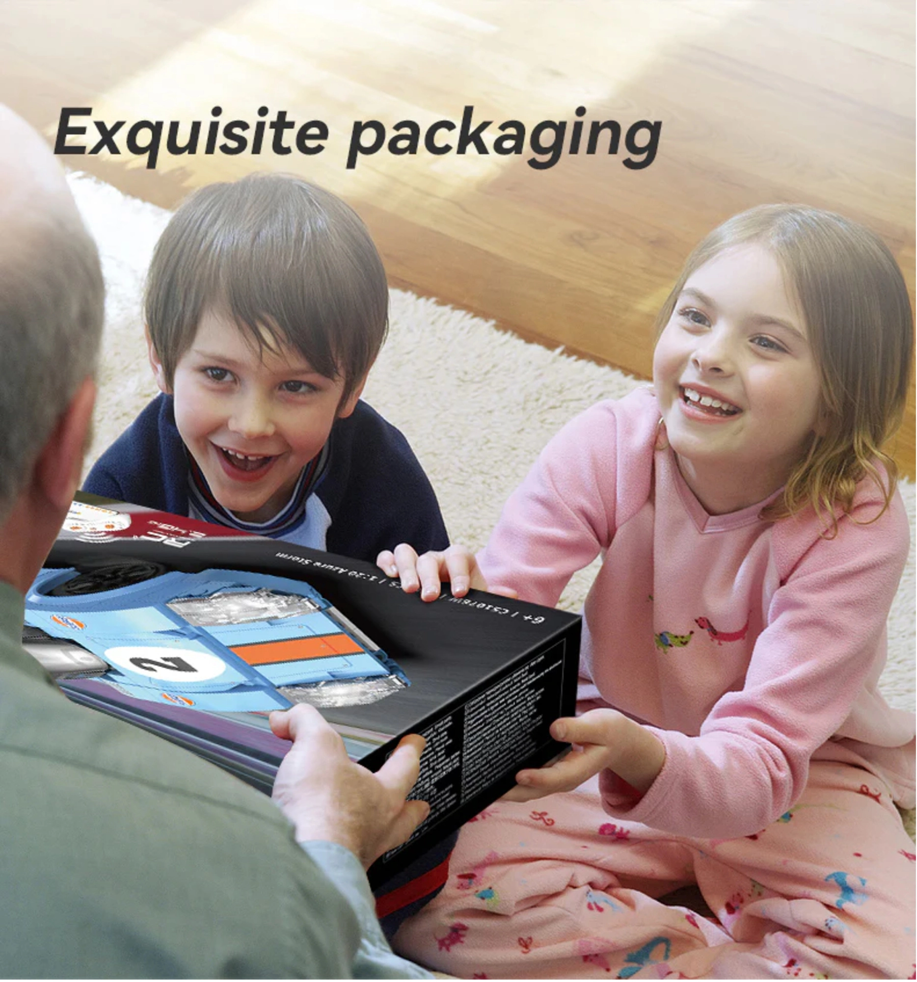 Coche de carreras aerodinámico con velocidad de hasta 5,7 km/h. Ideal para circuitos caseros y sprints rápidos en superficies lisas.