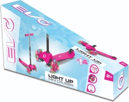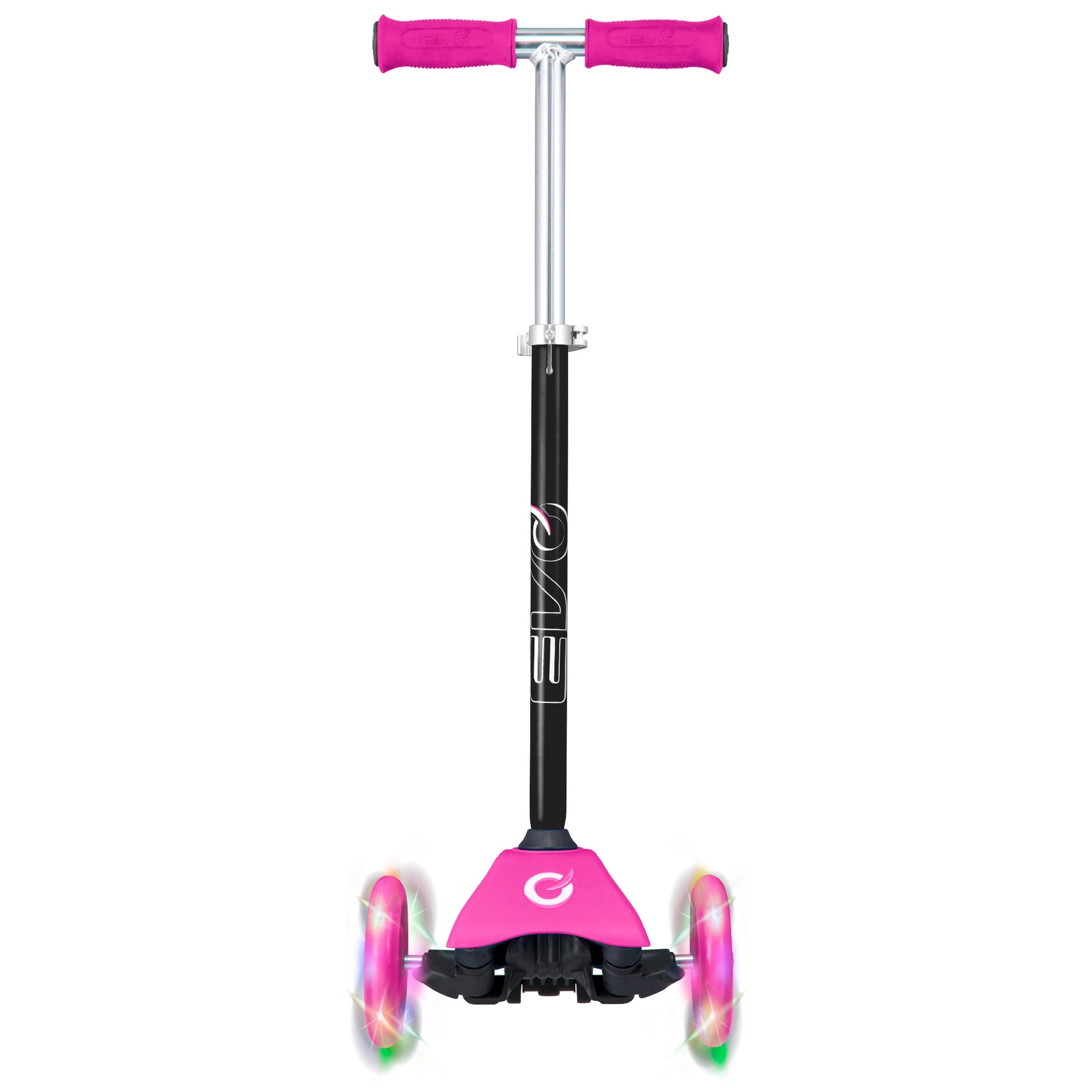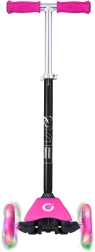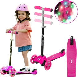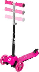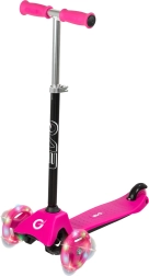 Patinete infantil EVO Mini Cruiser ligero y estable con tres ruedas para aprender el equilibrio fácilmente. Ofrece ruedas LED luminosas, dirección basculante (de equilibrio), manillar regulable en altura y freno trasero de pie. El diseño en rosa atrae a los pequeños pilotos, mientras que la conducción silenciosa y la amplia base antideslizante garantizan comodidad y seguridad.
