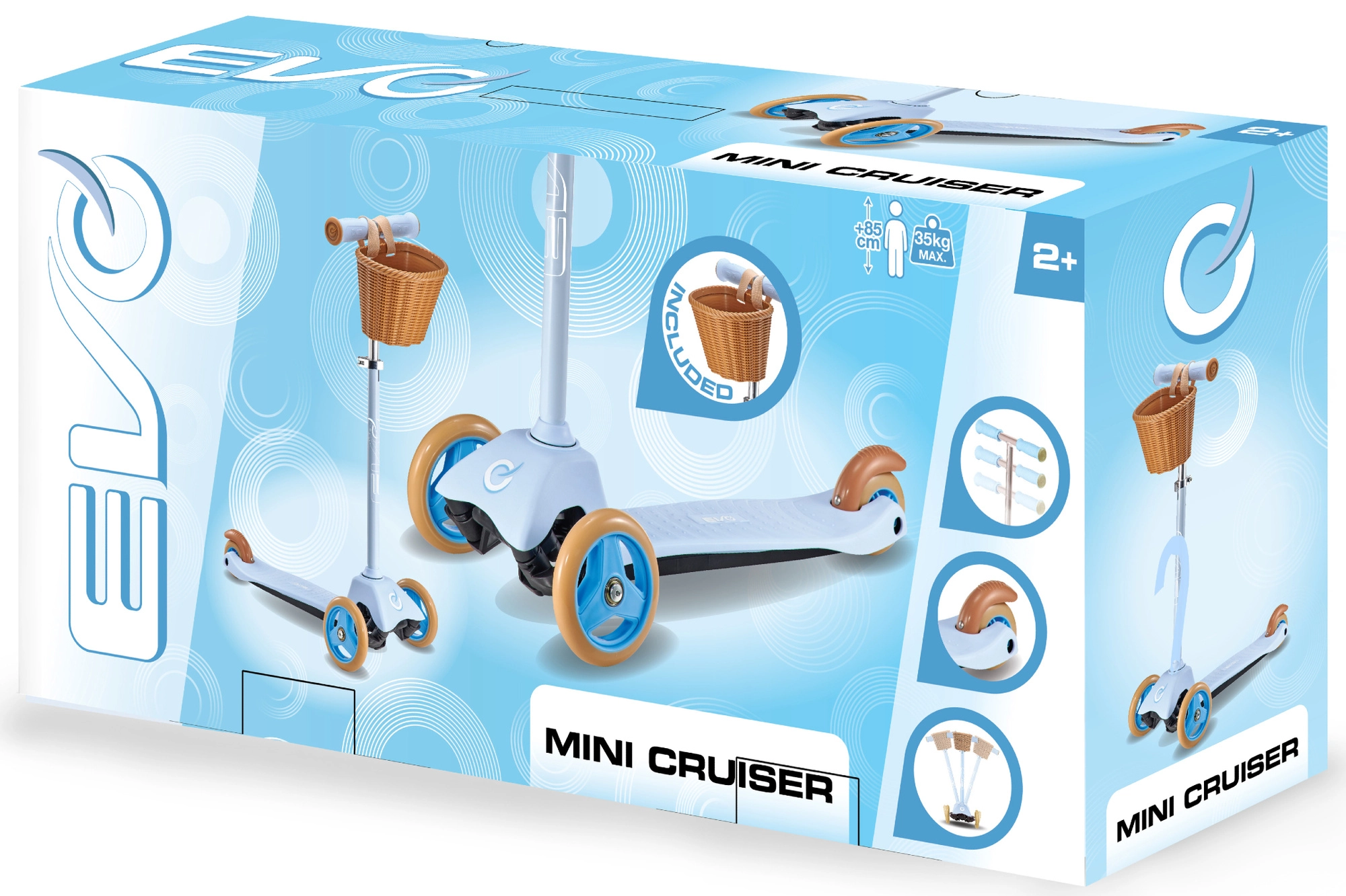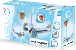 El patinete infantil EVO Mini Cruiser, ligero y estable, con tres ruedas y cesta desmontable, es ideal para pequeños pilotos a partir de 2 años. Gracias al sistema de dirección por balanceo, a las dos ruedas delanteras y a la amplia plataforma antideslizante, ofrece excelente estabilidad y control seguro. El manillar de altura ajustable crece con el niño y el freno de pie en el guardabarros trasero garantiza una parada fiable.