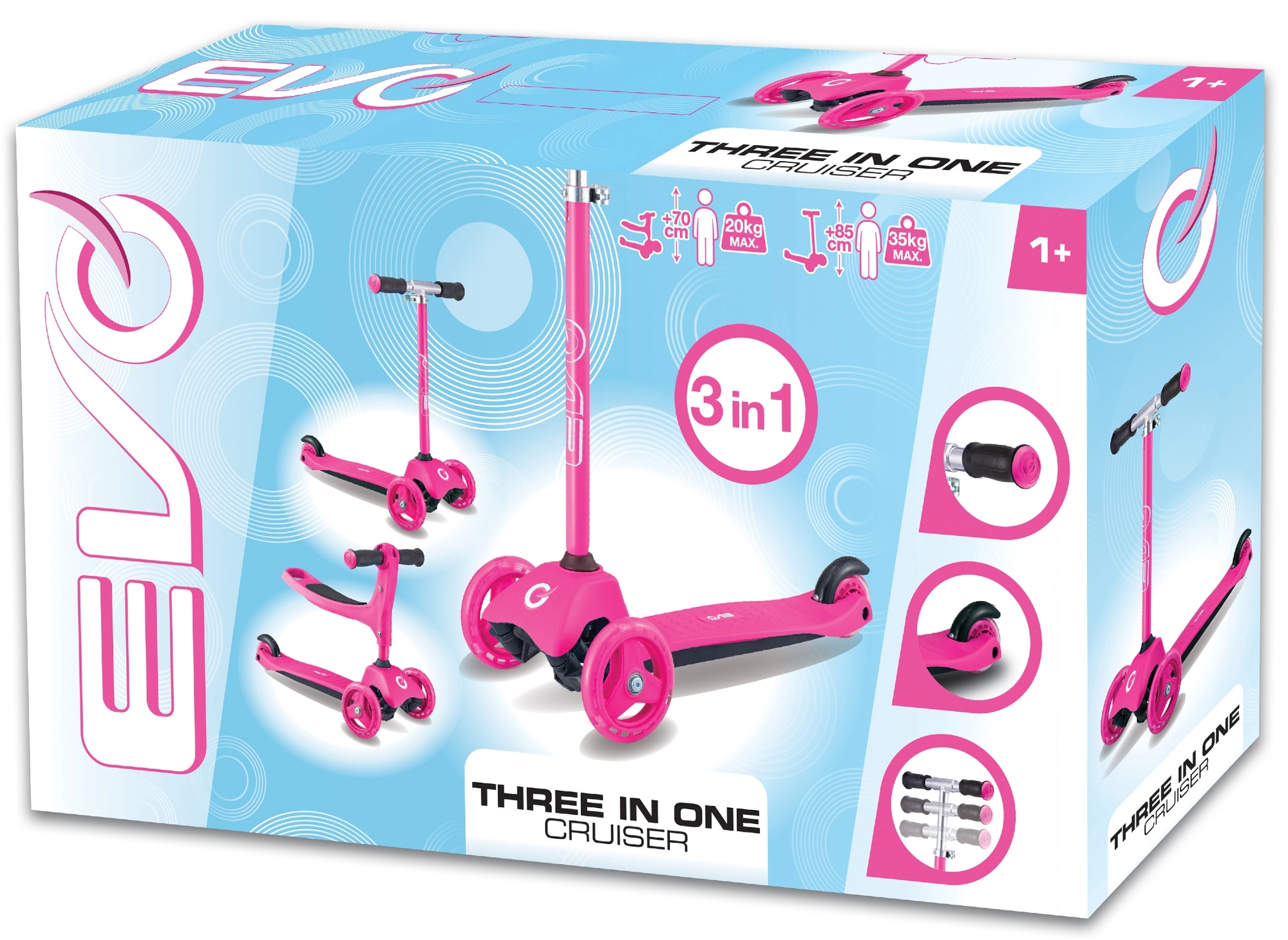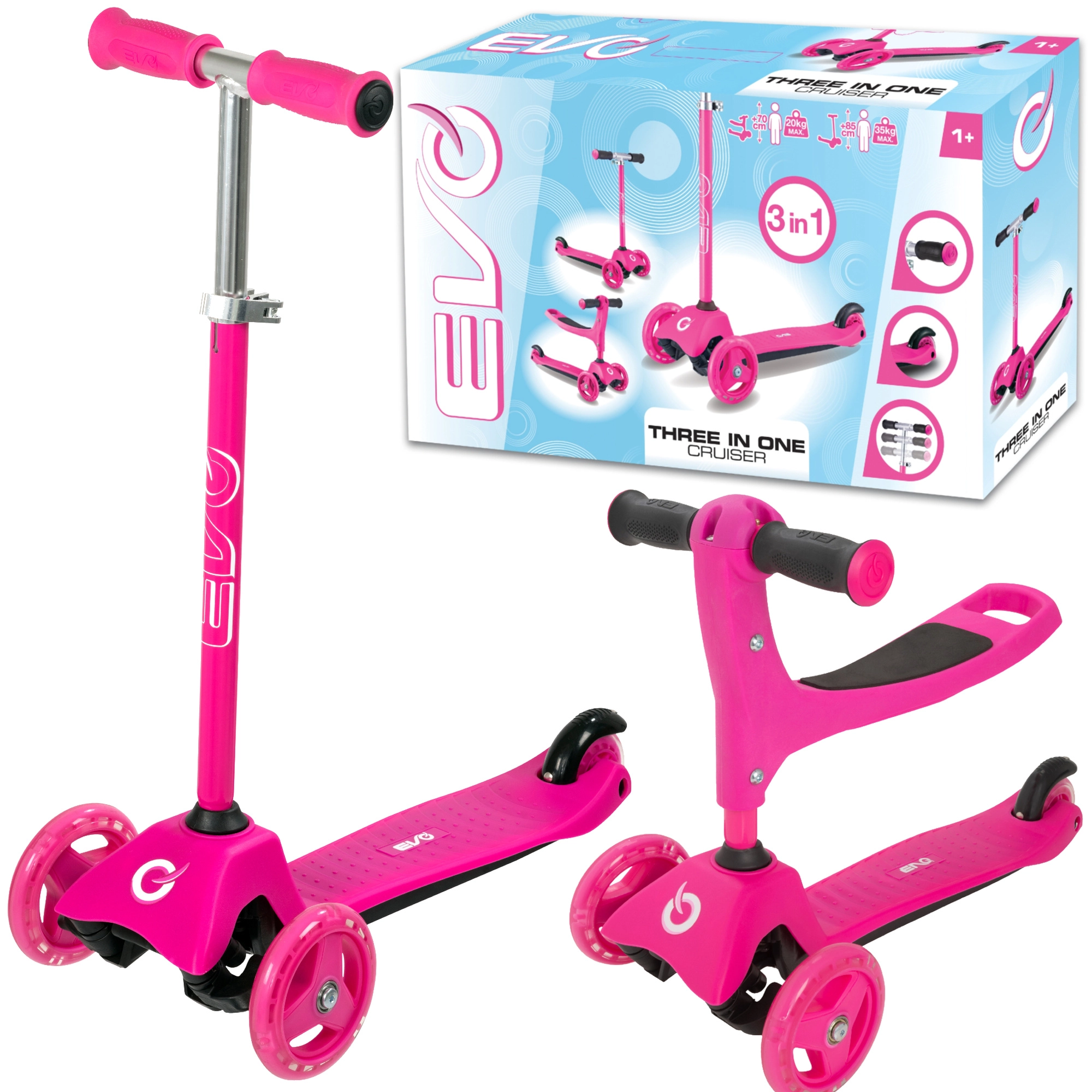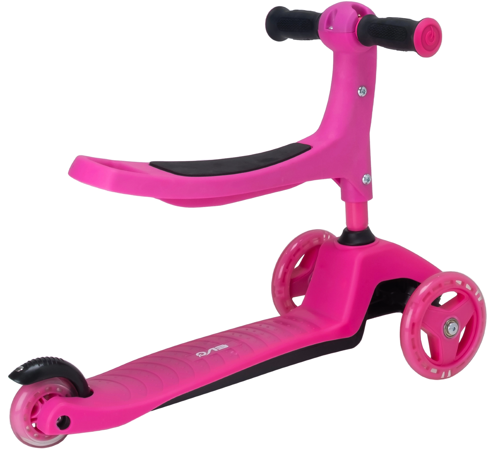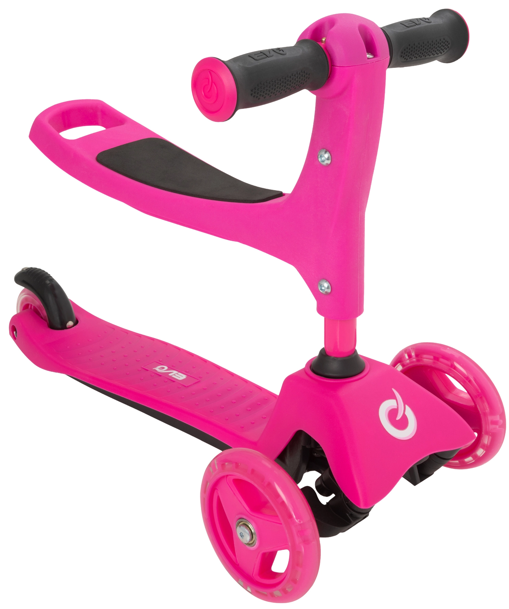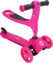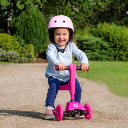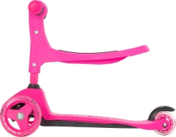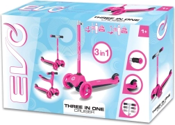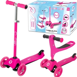 El patinete infantil 2 en 1 EVO en color rosa crece con tu hijo: en un momento lo conviertes de correpasillos con asiento en un patinete/triciclo estable. Gracias a las dos ruedas delanteras, la base baja y la dirección por inclinación ofrece excelente estabilidad, manejo sencillo y frenado seguro con el guardabarros trasero. El manillar regulable en altura, las ruedas silenciosas con rodamientos ABEC-5 y la plataforma antideslizante garantizan un paseo cómodo y divertido para los más pequeños y también para niños mayores.