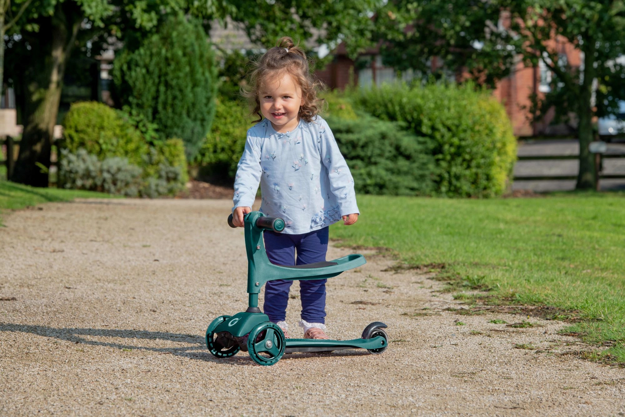 Este inteligente patinete de tres ruedas 2 en 1 se transforma en un momento de correpasillos con asiento a patinete clásico. Gracias al manillar regulable (aprox. 40 cm en modo correpasillos y 62–72 cm en modo patinete) crece con el niño y aporta seguridad en los primeros paseos y más tarde en impulsos más ágiles.