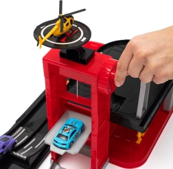 Incluye un helicóptero con zona de aterrizaje, gasolinera y 4 cochecitos de metal para escenarios de juego variados y misiones de rescate.