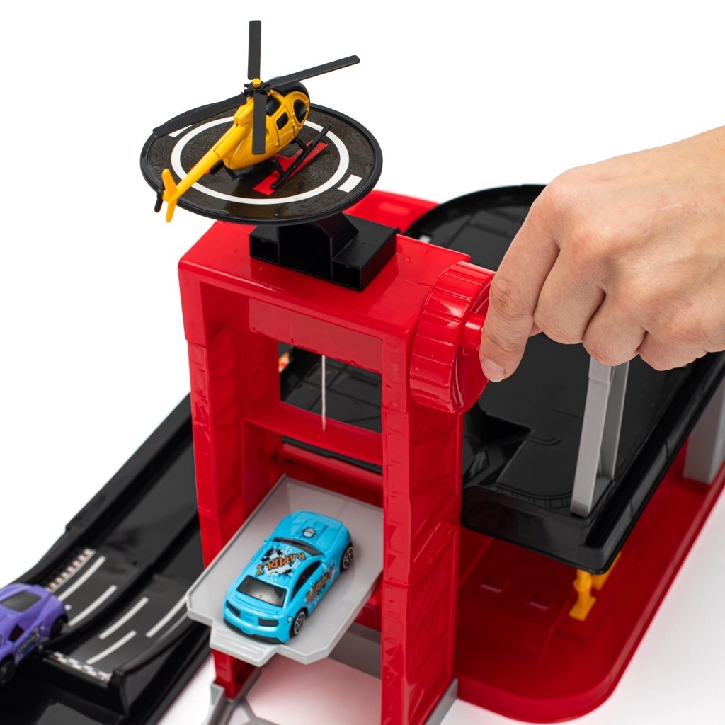 Un mando giratorio eleva la plataforma con el coche entre los niveles. Los niños practican la motricidad fina y disfrutan de un aparcamiento y traslados realistas.