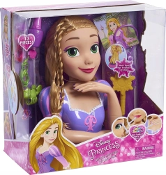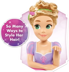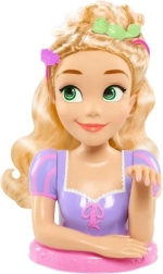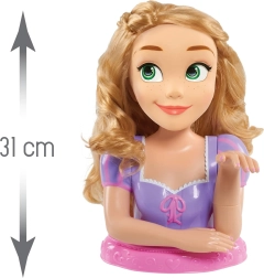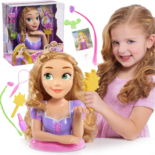 Esta lujosa cabeza de estilismo de Rapunzel ofrece a los niños todo lo necesario para crear peinados mágicos. Gracias a su larga melena rubia, es fácil peinar, ondular y trenzar, combinando diferentes adornos. La base estable mantiene la cabeza firme sobre la mesa, para que los niños se concentren en el juego creativo.