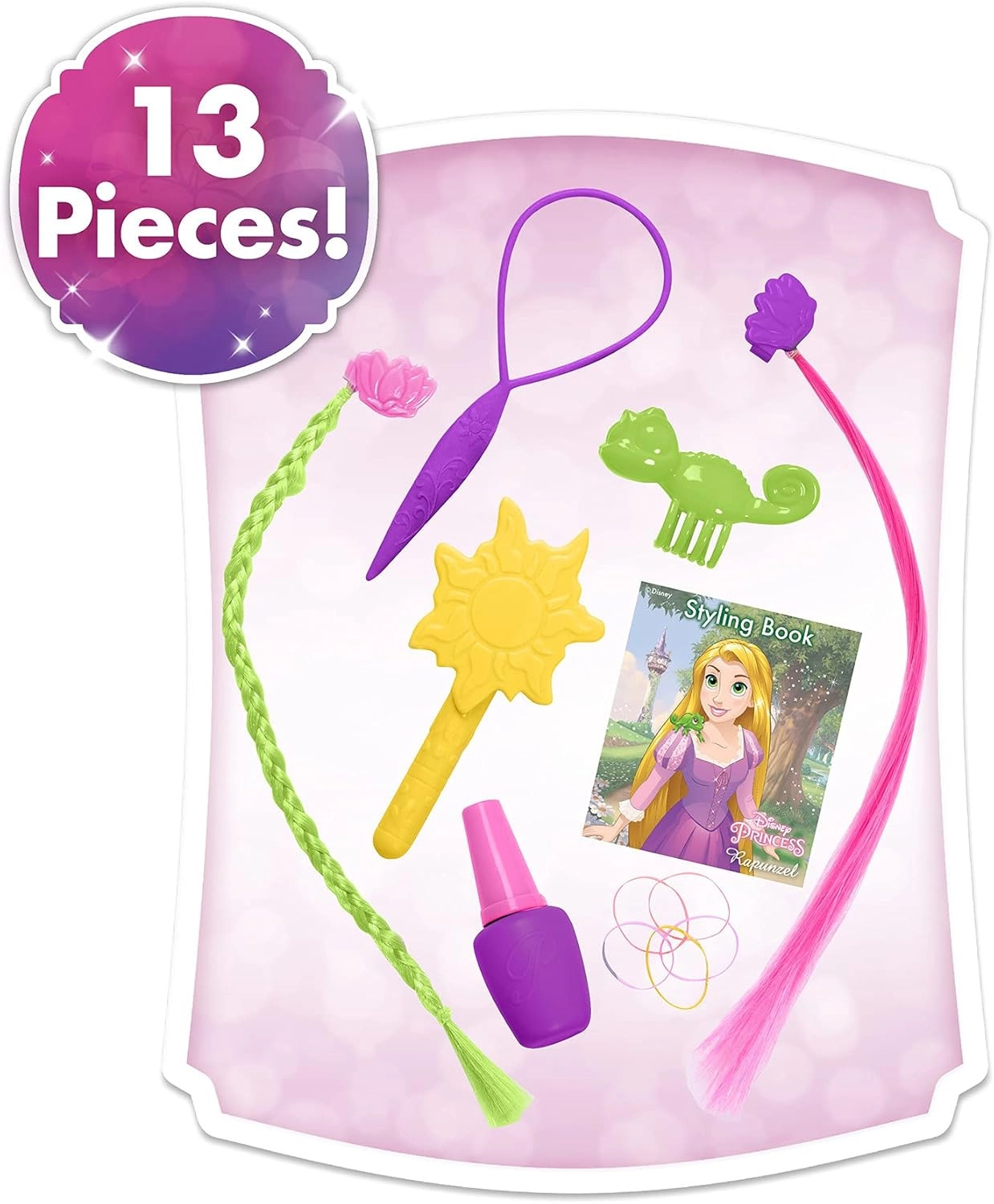 Incluye un set de 13 piezas con prácticas herramientas: cepillo, herramienta para crear peinados, gomas de colores, clips con mechones, horquillas temáticas y un pequeño libro de ideas para inspiración rápida. Los accesorios pueden utilizarse tanto en la cabeza de Rapunzel como en el propio cabello del niño.