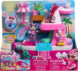 Incluye figuras de MINNIE, DAISY y el adorable perrito Snowpuff, que puedes sentar en sillones, poner en el columpio o lanzar por el tobogán. Luces y sonidos y la brillante “bola de discoteca” añaden una atmósfera mágica a cada escena, mientras que el agua fría de la piscina activa el cambio de color mágico.