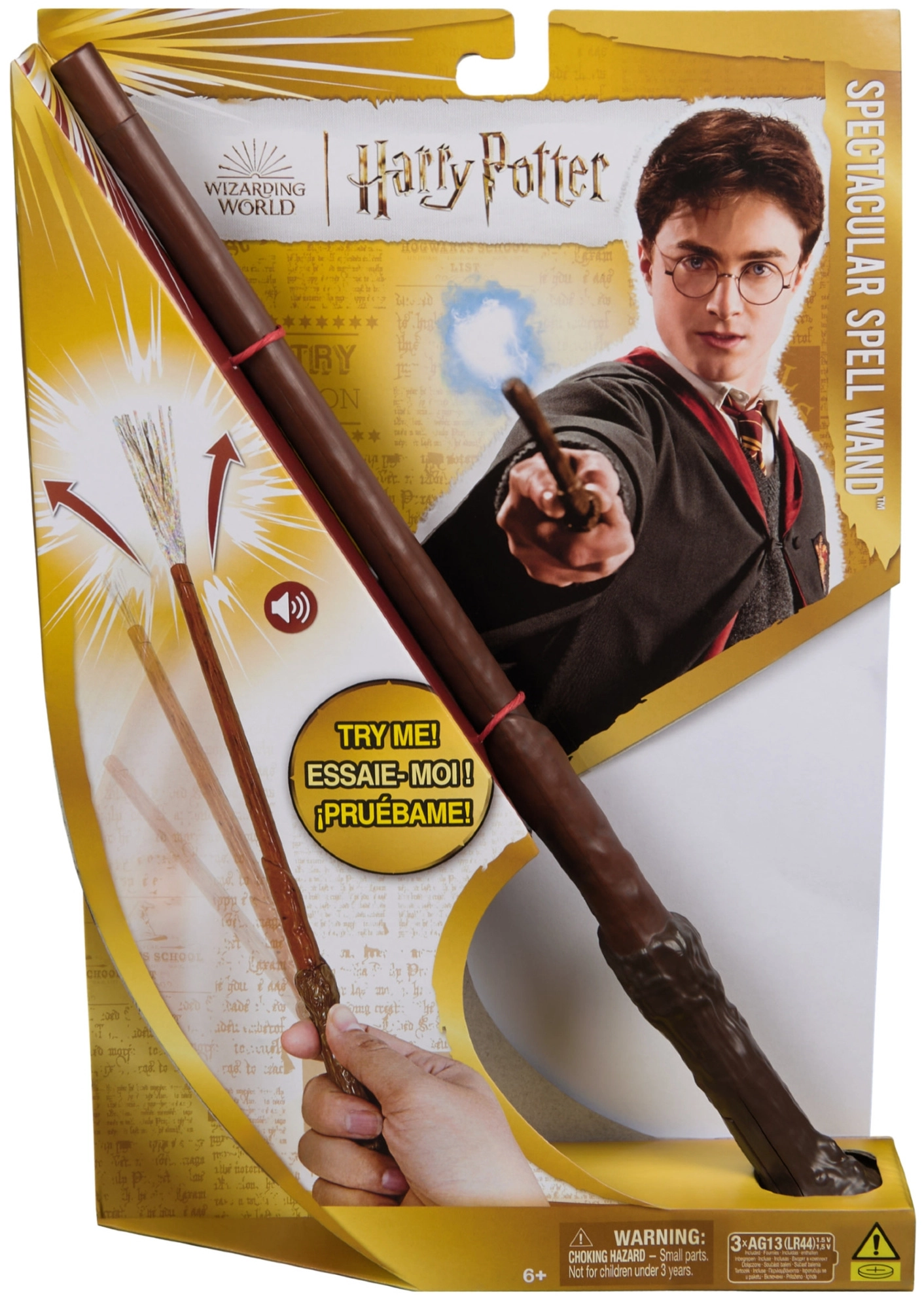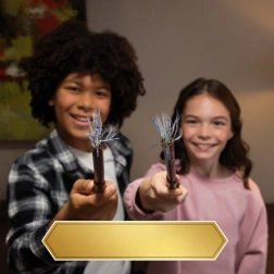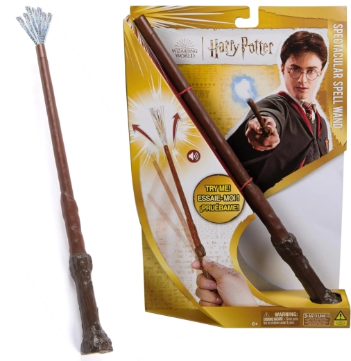 Déjate llevar por la atmósfera mágica de la saga cinematográfica de HARRY POTTER y prueba la varita realista Spectacular Spell. La varita se activa con el movimiento de la mano, lo que aporta a cada encantamiento el efecto adecuado. Tras realizar el hechizo, aparecen en la punta tiras plateadas que imitan la luz mágica, y oirás un breve sonido.