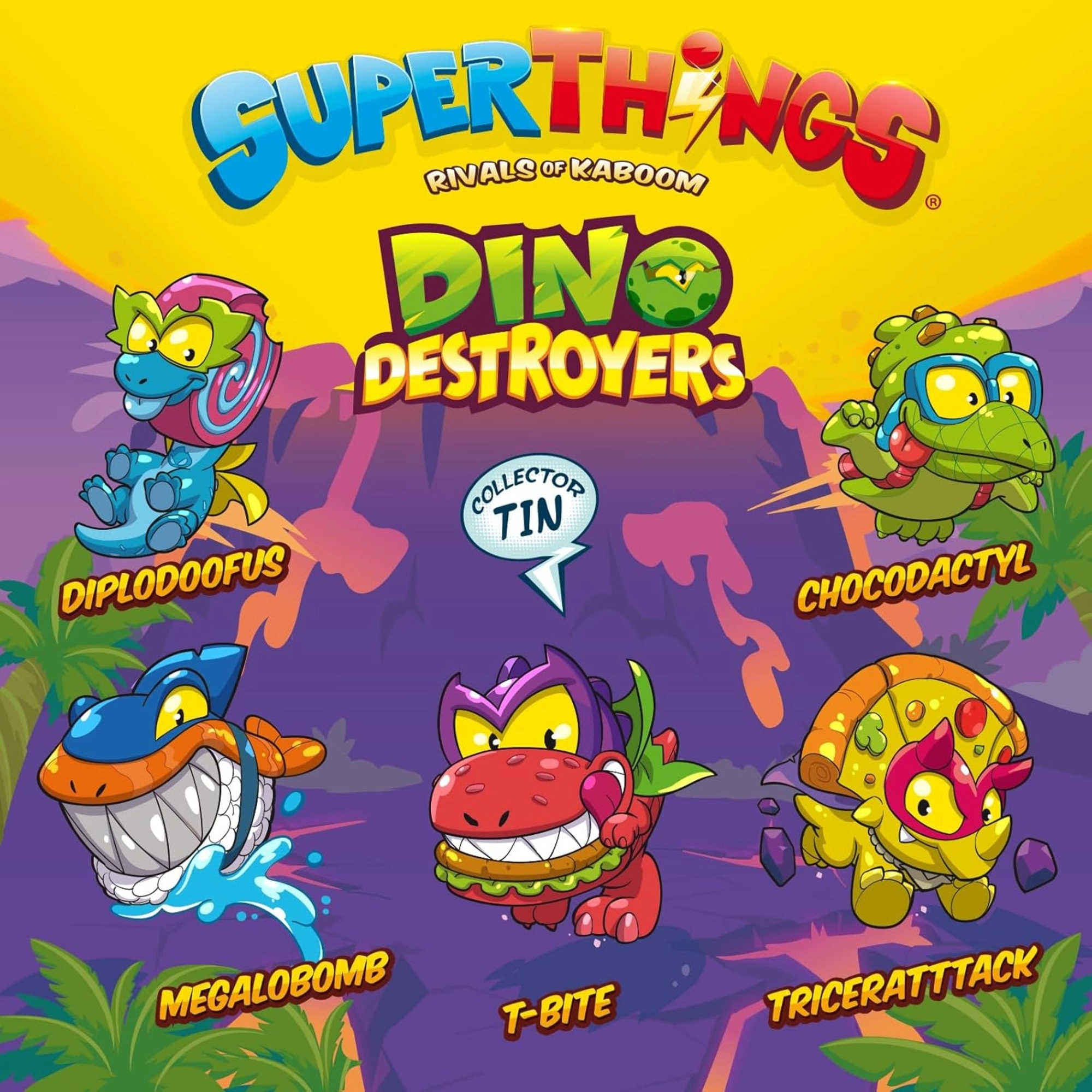 Descubre la sensación coleccionable SuperThings Dino Destroyers en una elegante lata plateada. Dentro encontrarás 5 figuras exclusivas que no hallarás en ningún otro lugar y un envase metálico seguro, ideal para guardar la colección. El set combina motivos prehistóricos de dinos con comida y aporta diversión, exposición y valor coleccionista para los fans de Kaboom City.
