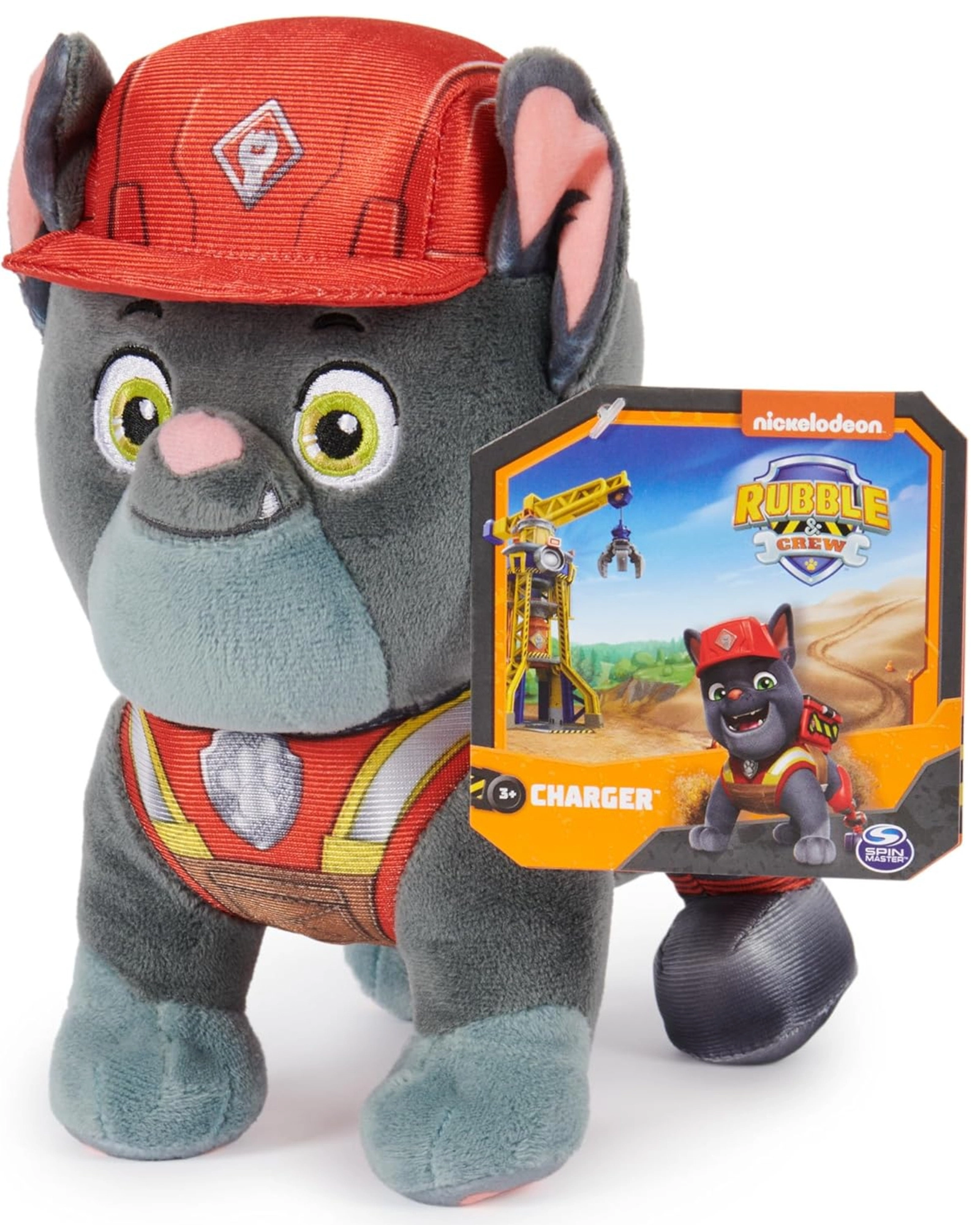 El peluche Charger es un enérgico bulldog francés de la serie PAW Patrol: Rubble & Crew, donde ayuda a transportar cargas pesadas. Este juguete de alta calidad de Spin Master captura fielmente su aspecto: desde el casco rojo y el chaleco con elementos reflectantes hasta el suave pelaje gris plateado y los grandes ojos bordados.
