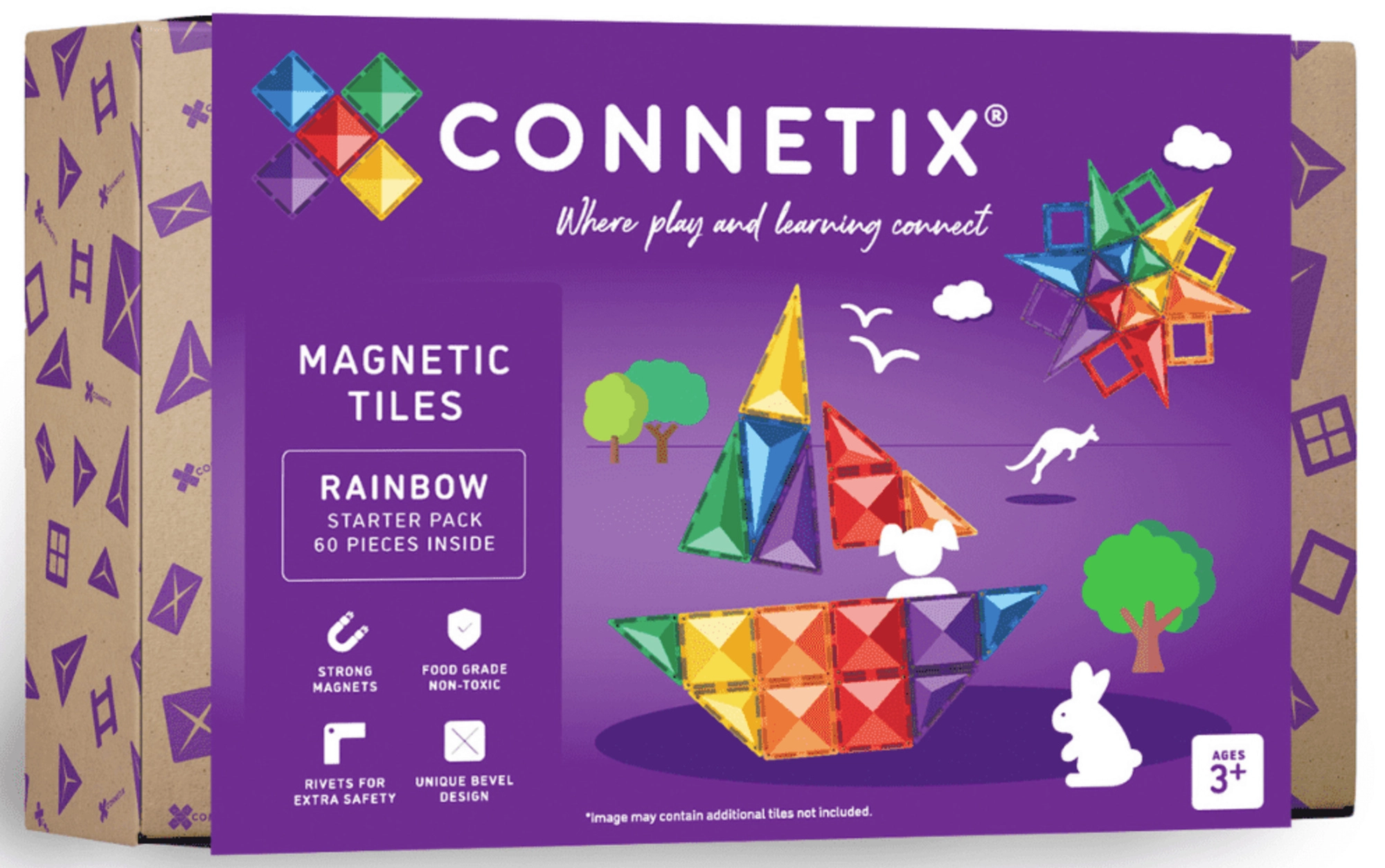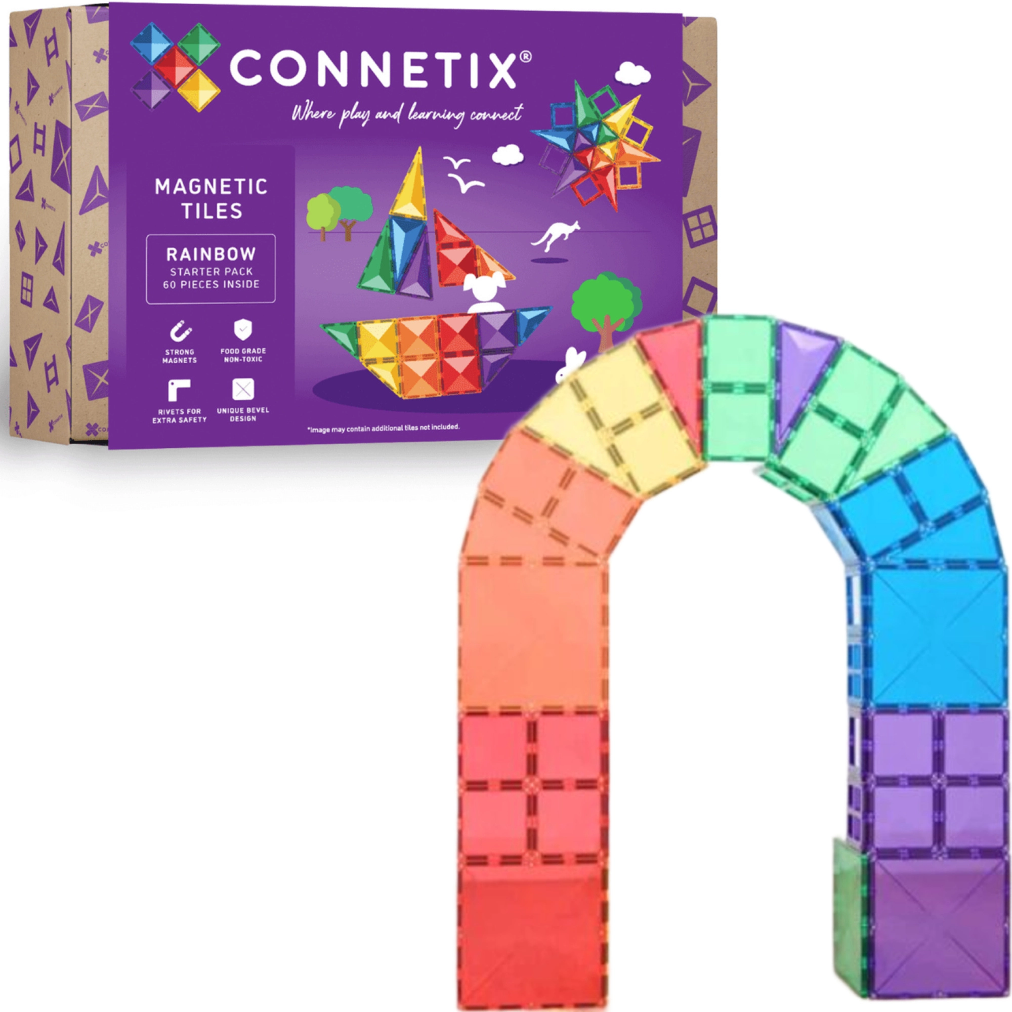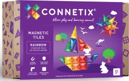 El Rainbow Starter Pack de CONNETIX incluye 60 baldosas magnéticas transparentes de alta calidad en colores intensos, con bordes redondeados y potentes imanes de neodimio para construcciones estables. A los niños les encantará el característico “clic” al unir las piezas mientras desarrollan de forma natural matemáticas, física, tecnología y arte.