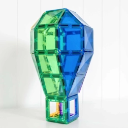 Diversas formas y colores translúcidos permiten construir castillos, torres, puentes y cohetes. Los niños exploran de forma natural la geometría y las relaciones espaciales en cada juego.