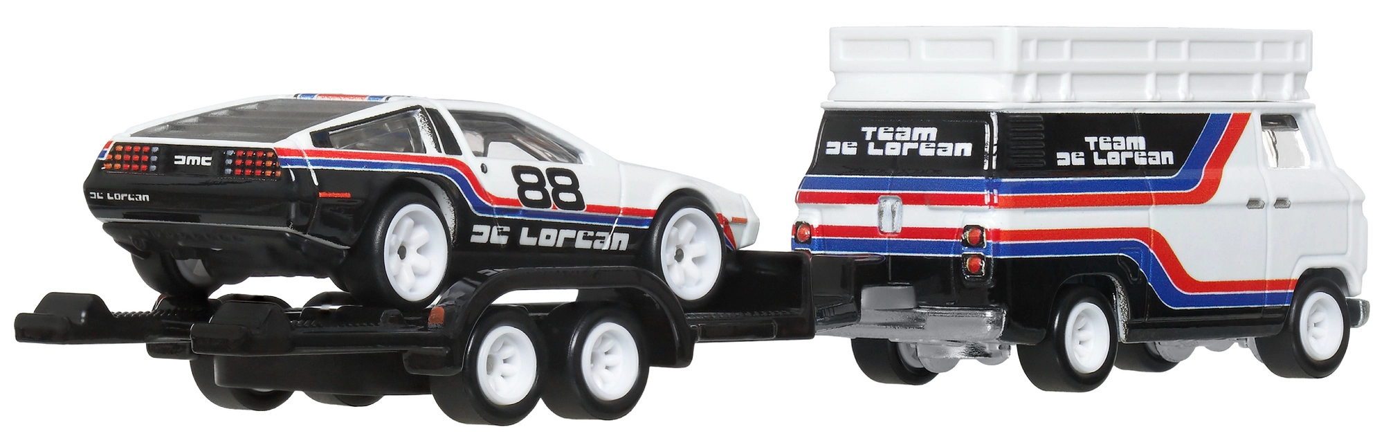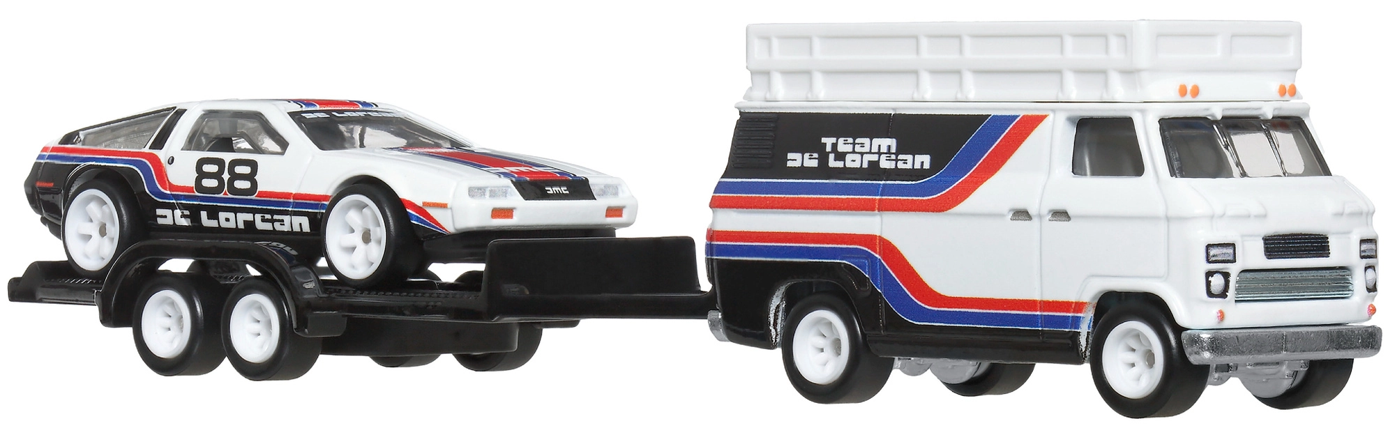 El set exclusivo de la línea Hot Wheels Premium Team Transport presenta el icónico DMC DeLorean #78 en un remolque tirado por un estiloso rally hauler. Gracias a la construcción Metal/Metal, a los neumáticos realistas Real Riders y a la decoración detallada Team DeLorean, es una opción perfecta para coleccionistas y para niños a partir de 3 años.