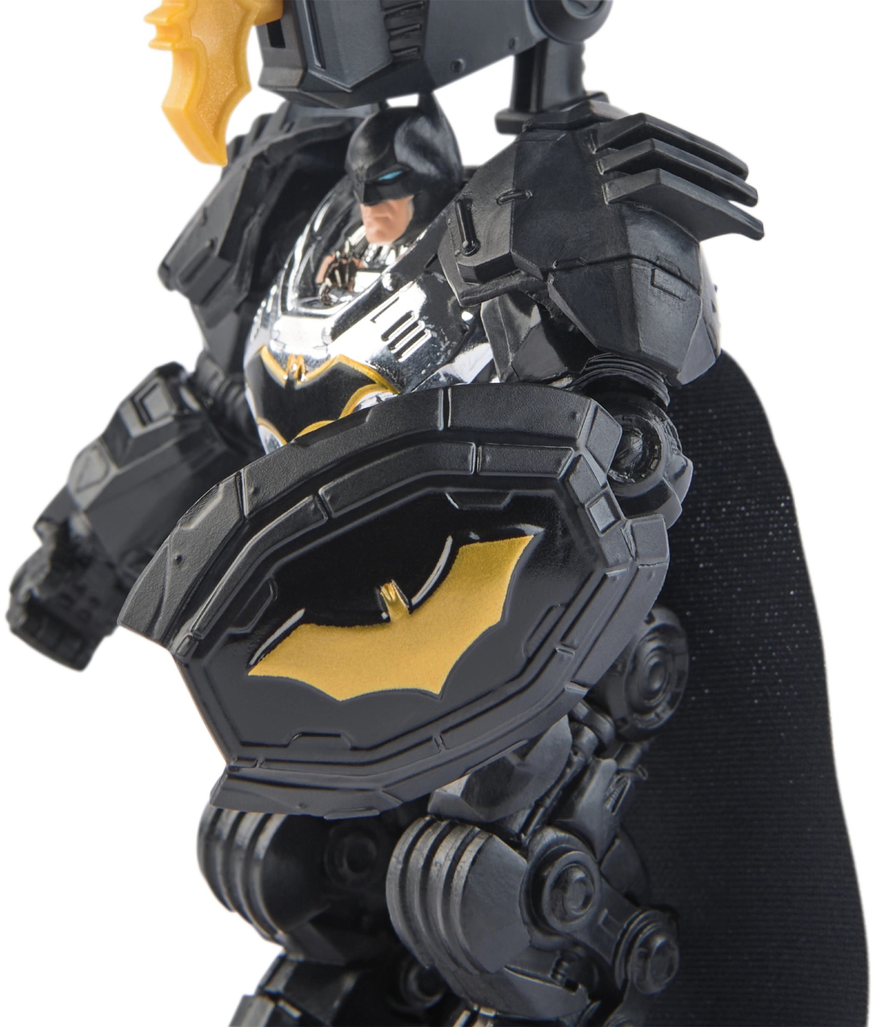 La detallada armadura negro‑plateada con elementos dorados reproduce fielmente el aspecto del héroe del universo DC. Ideal para coleccionistas y pequeños fans.