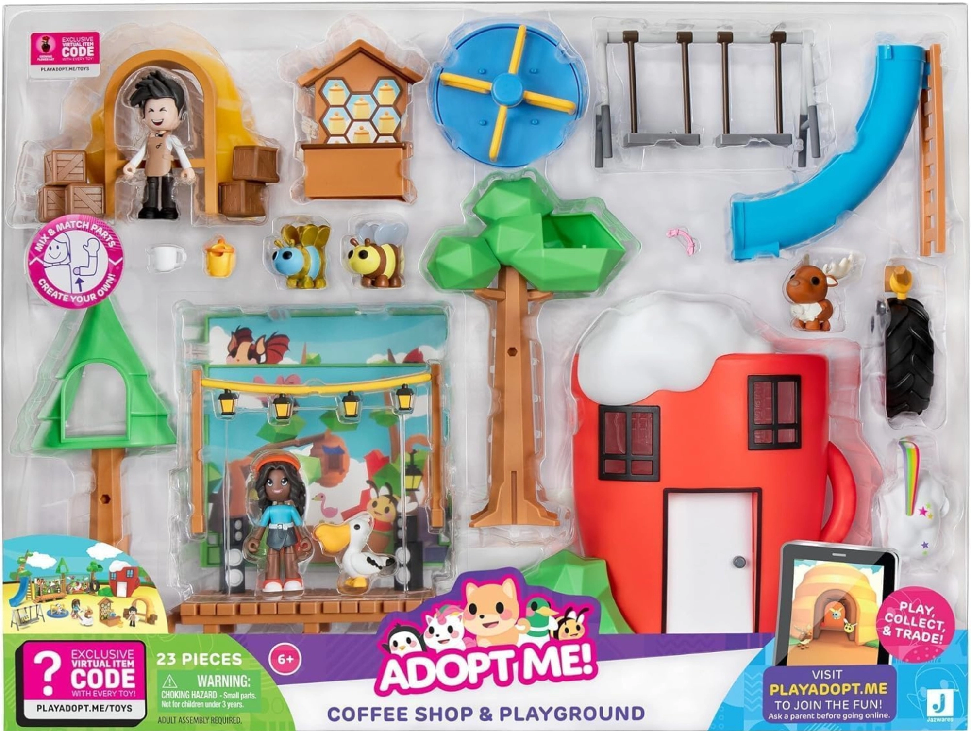 Descubre dos lugares icónicos de la isla ADOPT ME! en un solo set: una acogedora cafetería y un colorido parque infantil. Los niños pueden preparar bebidas en la barra, sentar a los clientes en las mesas y luego divertirse en el tobogán, los columpios o el tiovivo. Gracias a los elementos modulares, las escenas se pueden reorganizar fácilmente para crear nuevas historias.
