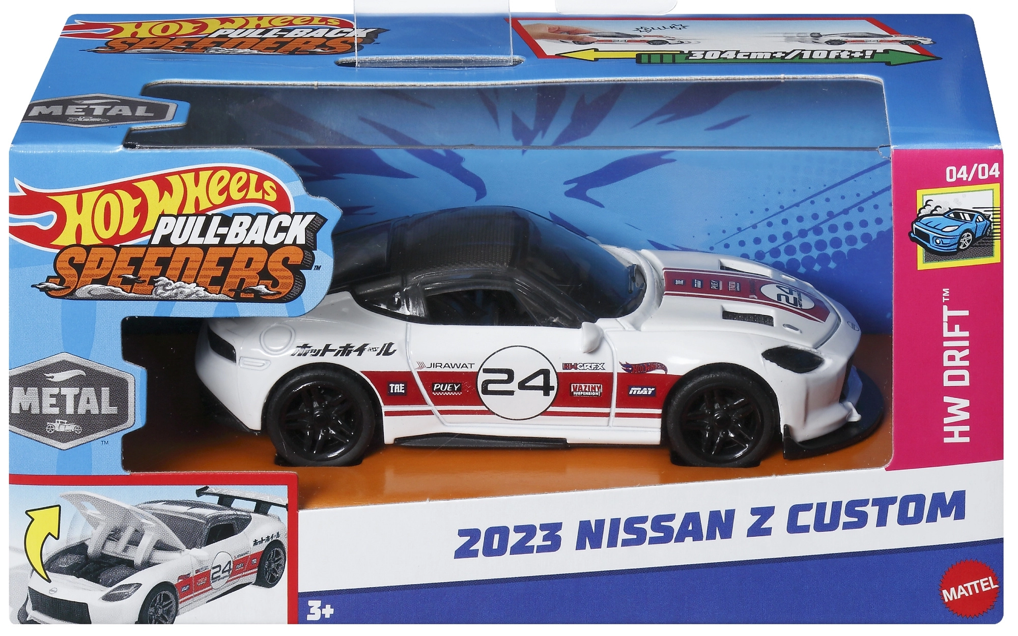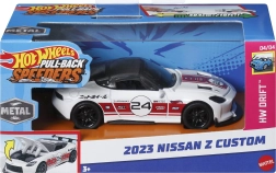 Prepárate para la diversión a toda velocidad con el modelo HOT WHEELS 2023 Nissan Z custom de la serie Pull‑Back Speeders a escala 1:43. Gracias al mecanismo de retroceso (pull‑back), basta con tirar del coche hacia atrás y soltarlo: saldrá hacia adelante rápida y dinámicamente. Su mayor tamaño, la carrocería blanca detallada y la conducción suave con ruedas de libre giro encantarán a fans pequeños y grandes.