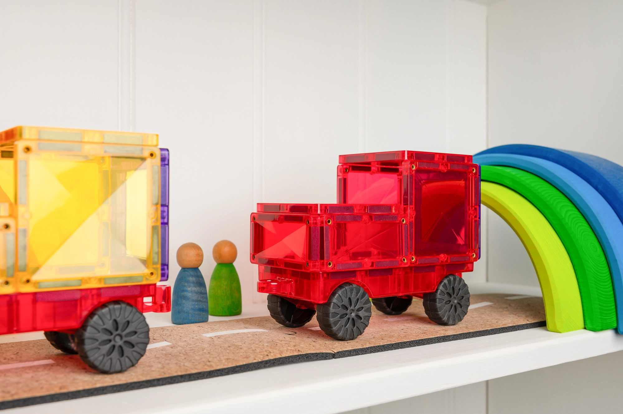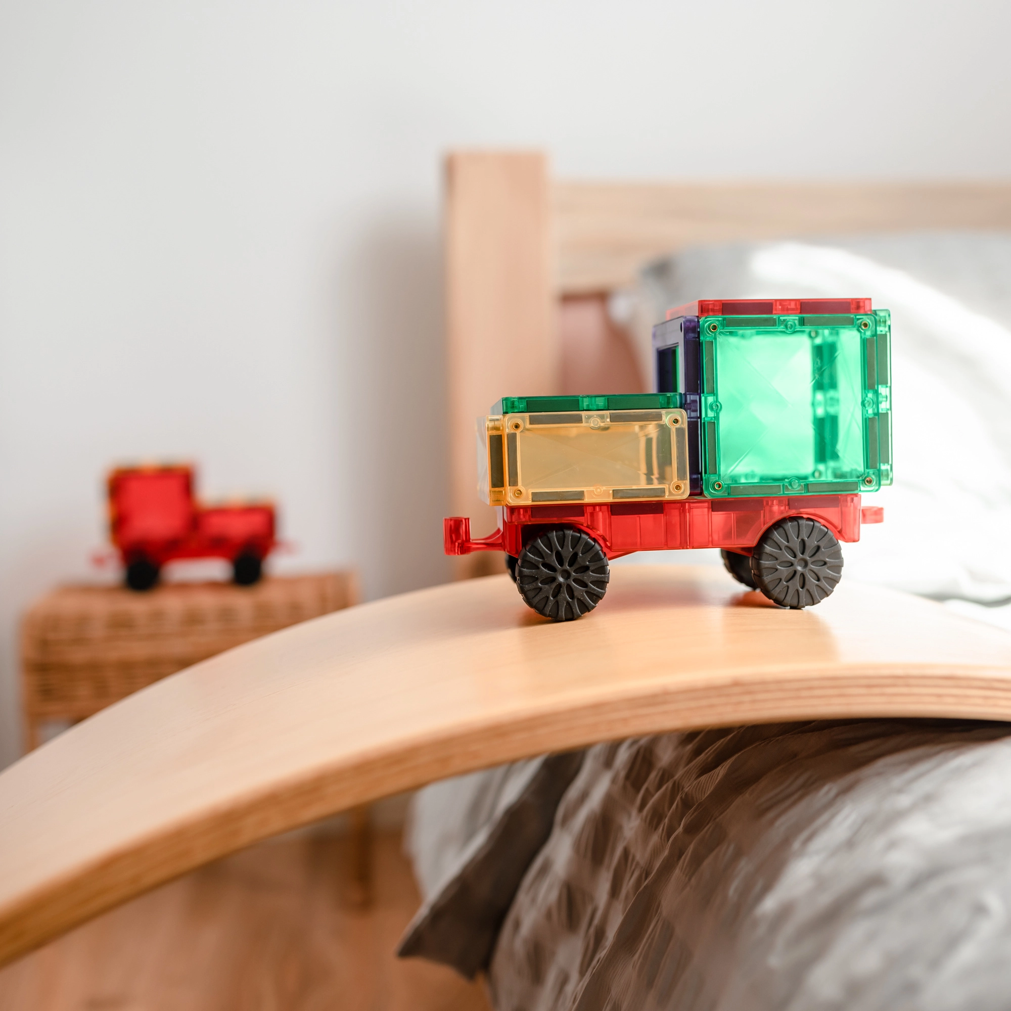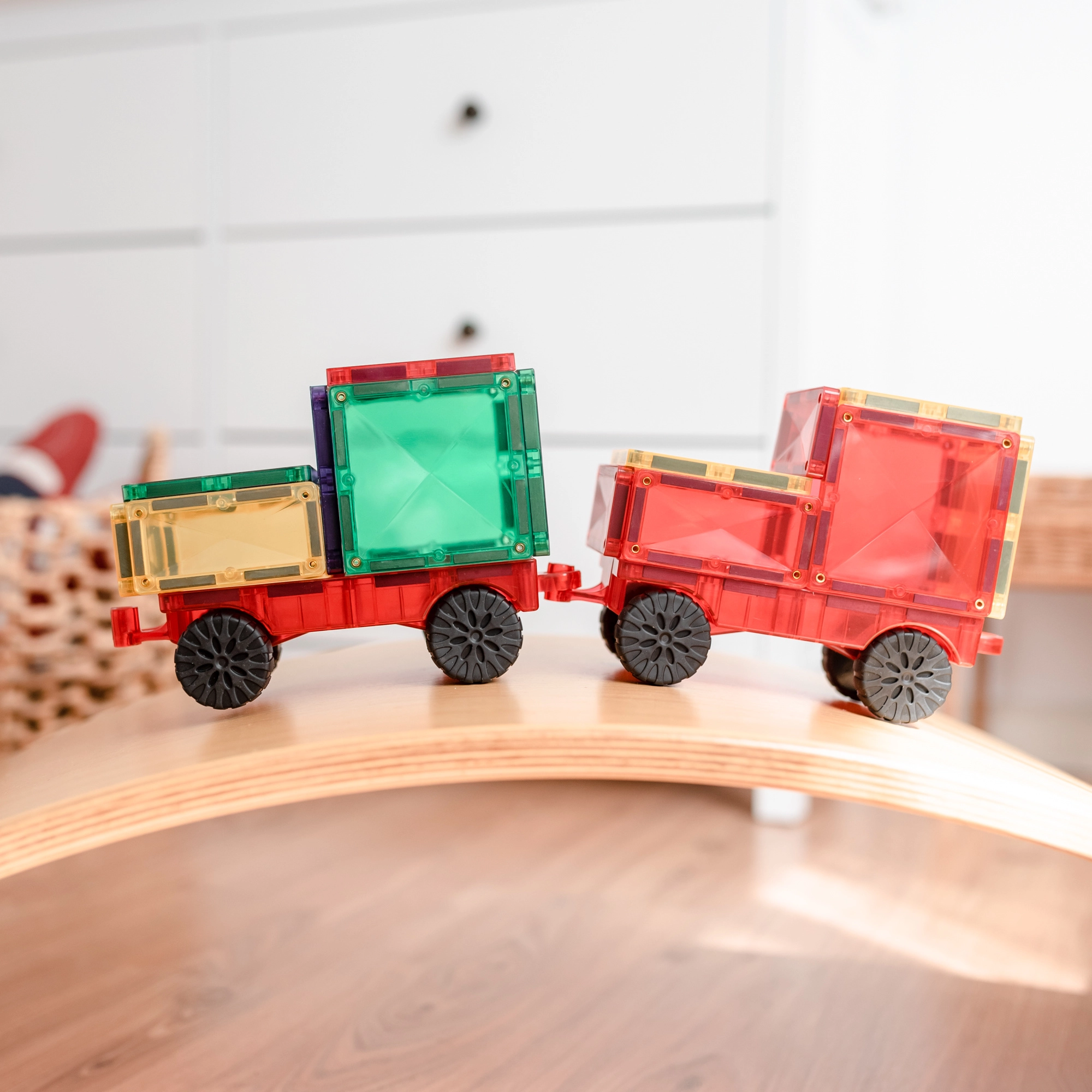 Dos chasis con ruedas transforman el set en un juego dinámico: desde camiones hasta trenecitos. Construye, conecta y ponte en marcha.