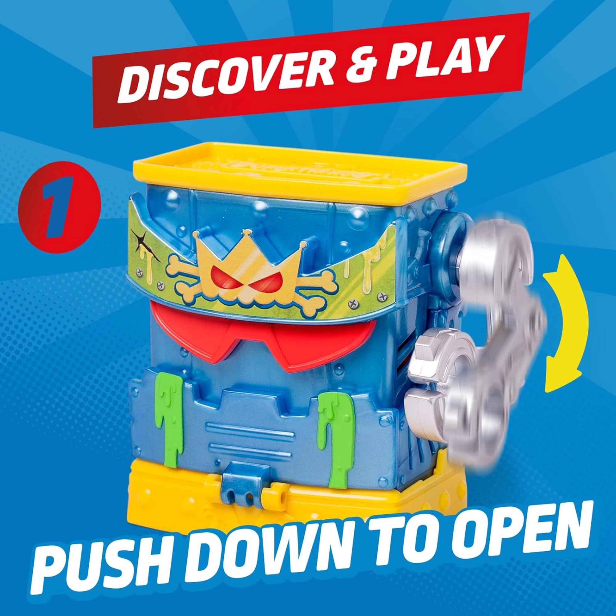Supera los mecanismos de defensa, consigue valiosas cápsulas de energía Kazoom y conviértete en el héroe de Kaboom City. La Base secreta de MR KING está llena de sorpresas: paneles giratorios y deslizantes, puertas falsas y trampas ingeniosas pondrán a prueba tu velocidad y astucia. El set es ideal para jugar en solitario o competir en pareja.