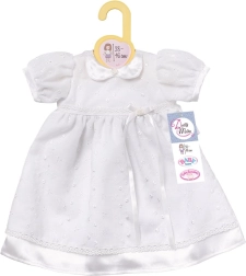 Este adorable vestido blanco convierte cualquier muñeca en una pequeña princesa. La tela suave con dibujo decorativo, el lazo discreto en la cintura y los ribetes satinados aportan una elegancia atemporal. Gracias a su confección resistente y a los materiales de calidad, el vestido soporta muchas horas de juego.