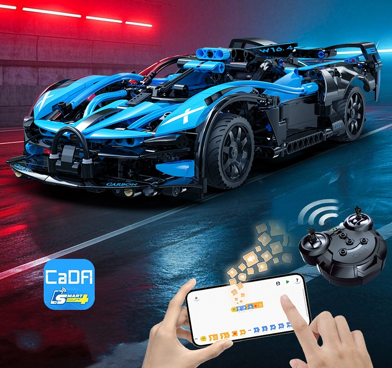 Gracias al control dual puedes elegir entre el mando de 2,4 GHz con un alcance de aprox. 25 m y velocidad de hasta 5,5 km/h, o la aplicación móvil (Android/iOS) con múltiples modos, incluido giroscopio y dibujo de ruta. Impresiones en lugar de pegatinas, líneas aerodinámicas y piezas de calidad compatibles con otros sets CaDA llevan el modelo y el juego a un nivel superior.