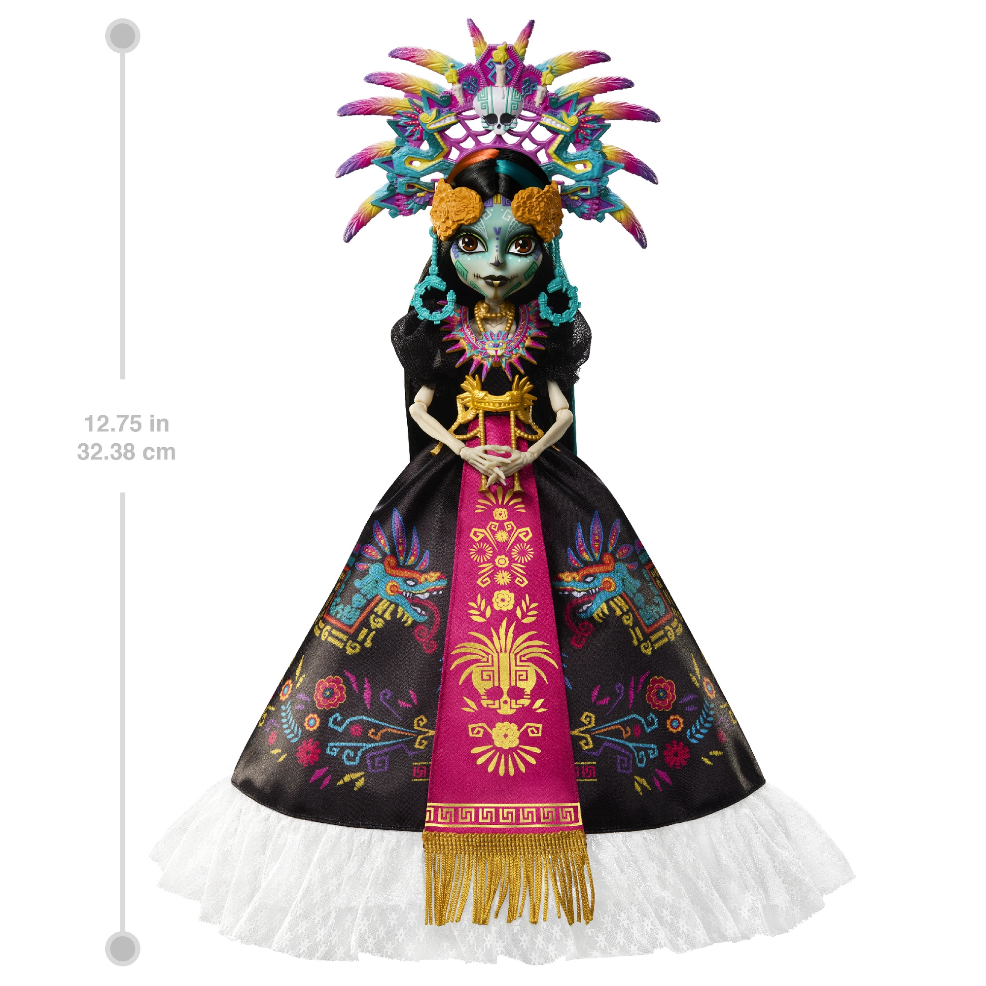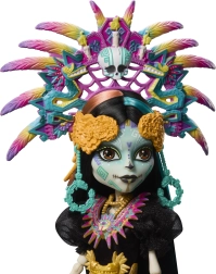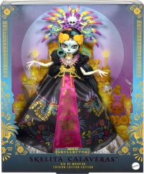 La edición de colección Monster High Skullector rinde homenaje a la festividad mexicana del Día de Muertos. Skelita Calaveras deslumbra con un vestido largo negro de brillo satinado, estampados coloridos y una llamativa banda magenta con flecos dorados. La diadema de plumas dominante, las joyas llamativas y el detallado face paint la convierten en una pieza excepcional para fans del diseño y la cultura.