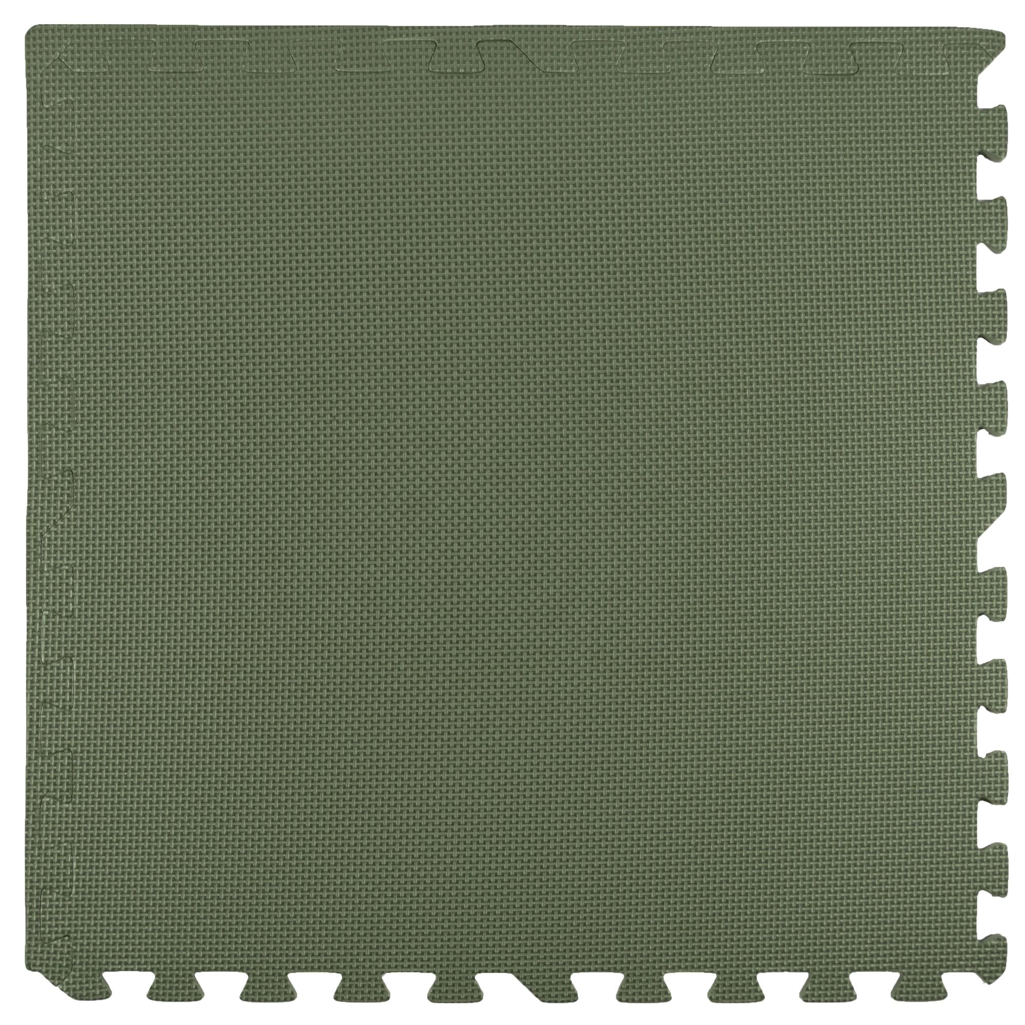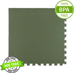 Alfombrilla de espuma EVA suave y segura en color caqui que protege del frío y amortigua caídas, es impermeable, fácil de limpiar y crece con el niño. El set incluye 3 piezas grandes de 60 × 60 cm y 6 bordes, que pueden unirse para crear una superficie mayor o diferentes formas. Cumple con las normas EN 71 y cuenta con certificación CE.