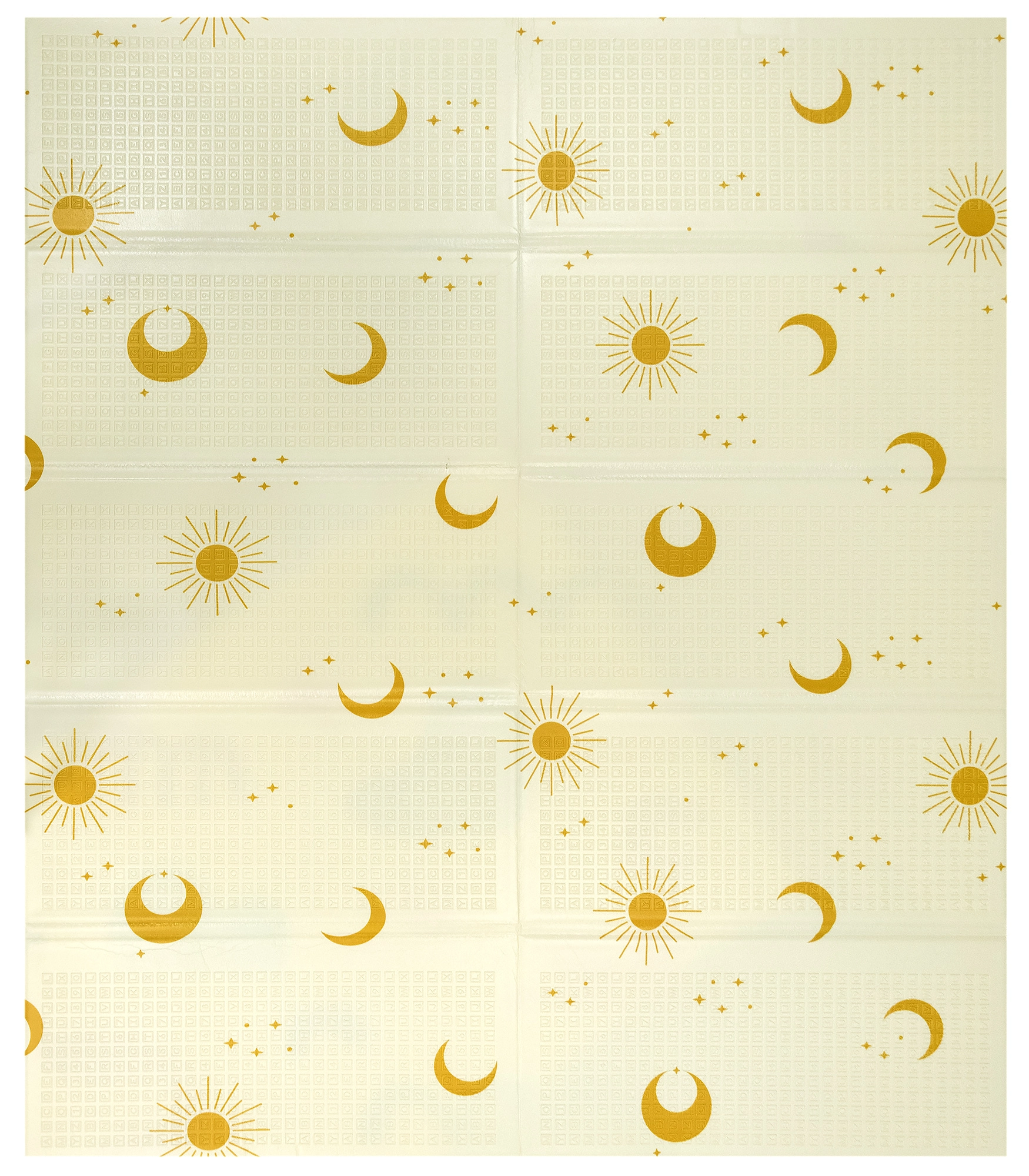 Espuma XPE prémium que proporciona una excelente amortiguación de impactos, aislamiento térmico del suelo frío y una larga vida útil sin olores ni sustancias tóxicas. La alfombra es adecuada para la habitación infantil, el salón e incluso exteriores: balcón, jardín o picnic. La impresión a doble cara en tonos suaves con motivos de sol y luna y formas de colores estimula la percepción y combina con interiores modernos.