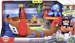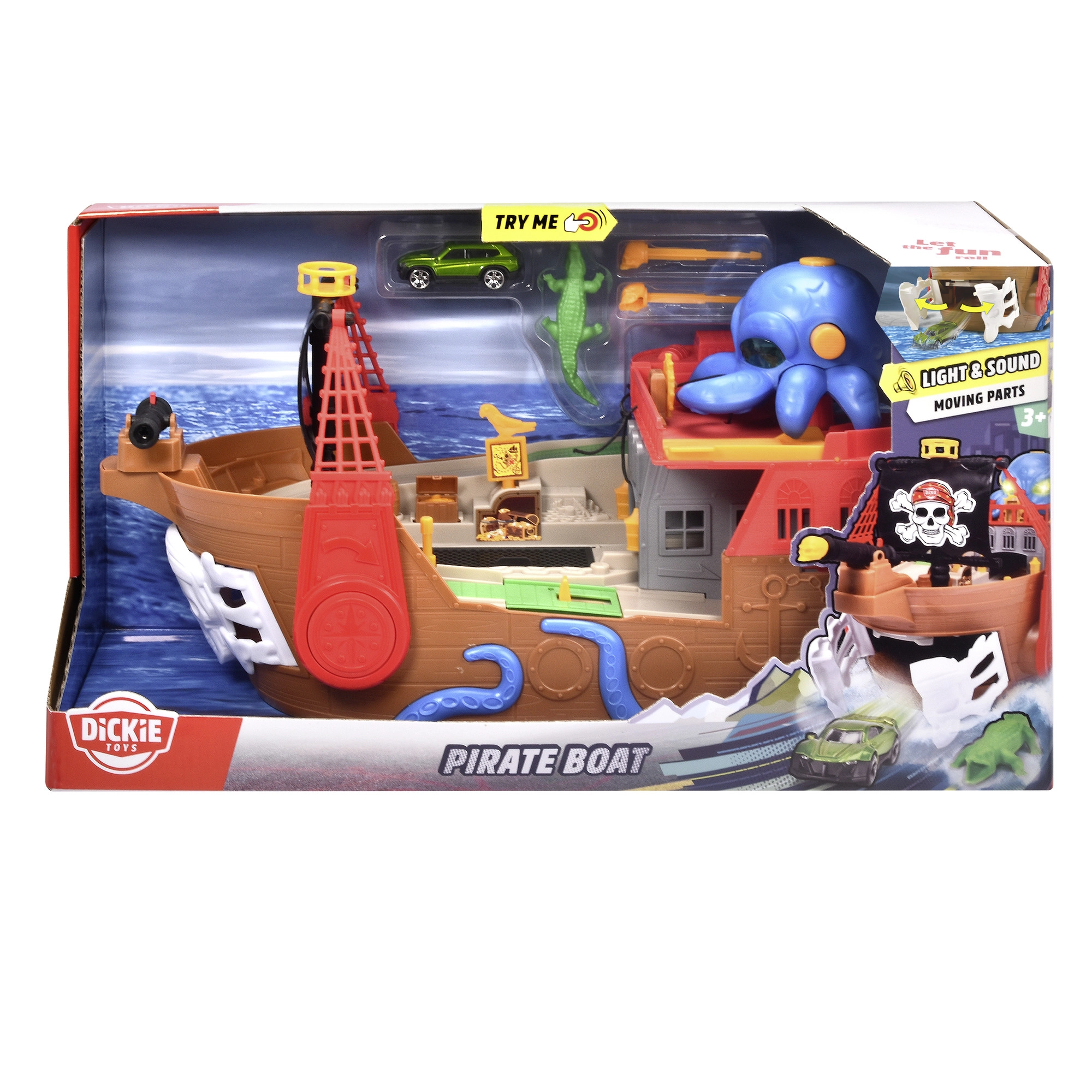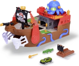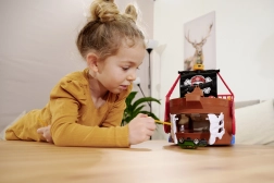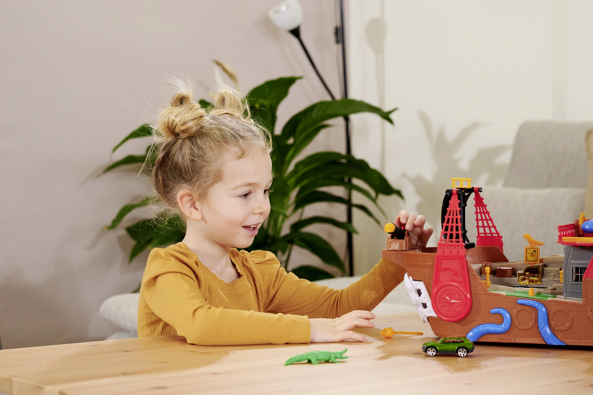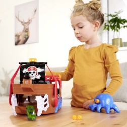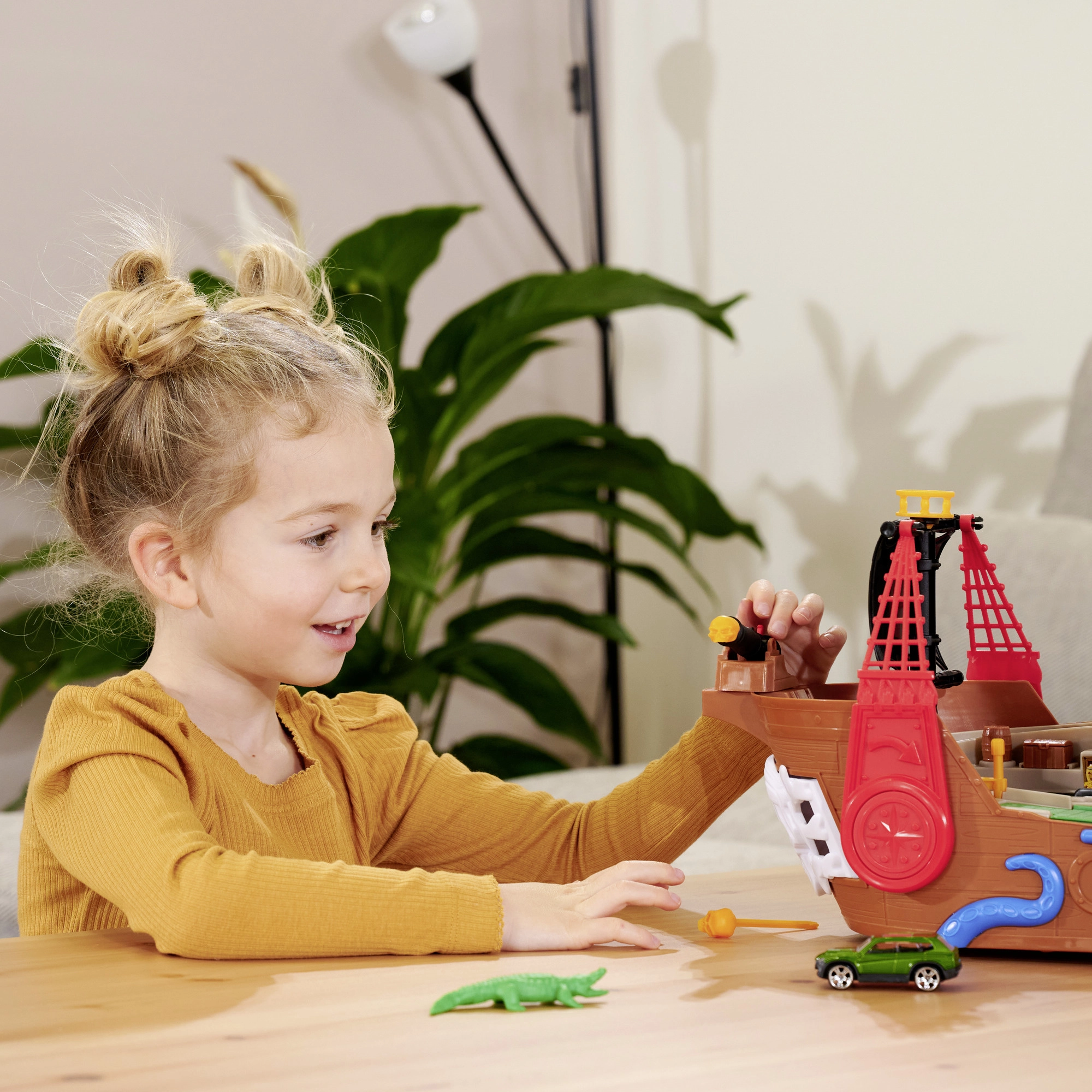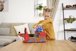 Este barco pirata, detalladamente elaborado, es un verdadero centro de diversión. Al levantar la cubierta se revela una pista integrada para coche metálico, donde mediante palancas y selectores decidirás si el vehículo sale disparado a través de la puerta de calaveras, termina en la prisión o es catapultado desde la balsa. No faltan el cañón funcional, el cofre del tesoro, barriles, un cocodrilo y más accesorios que fomentan el juego imaginativo.