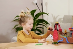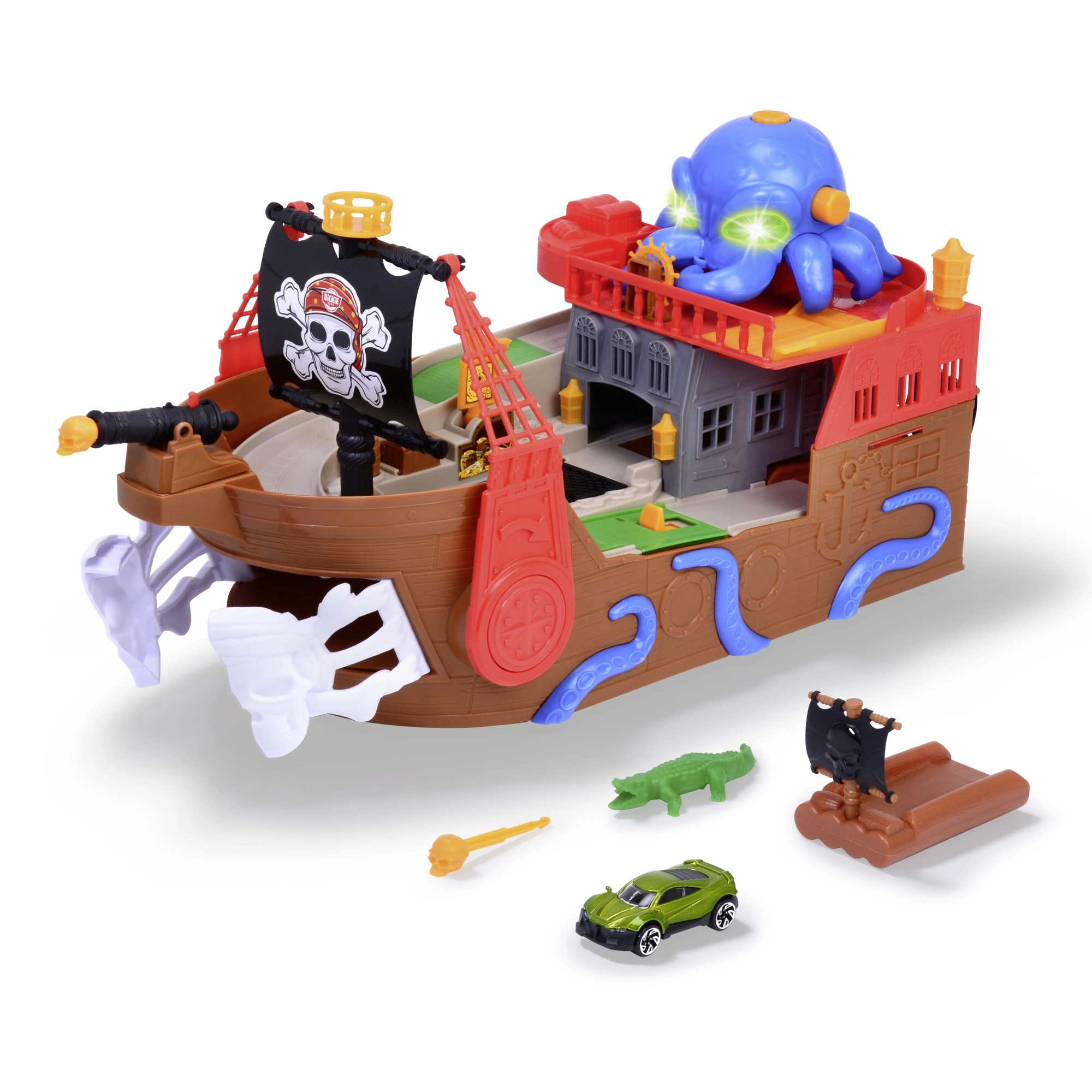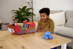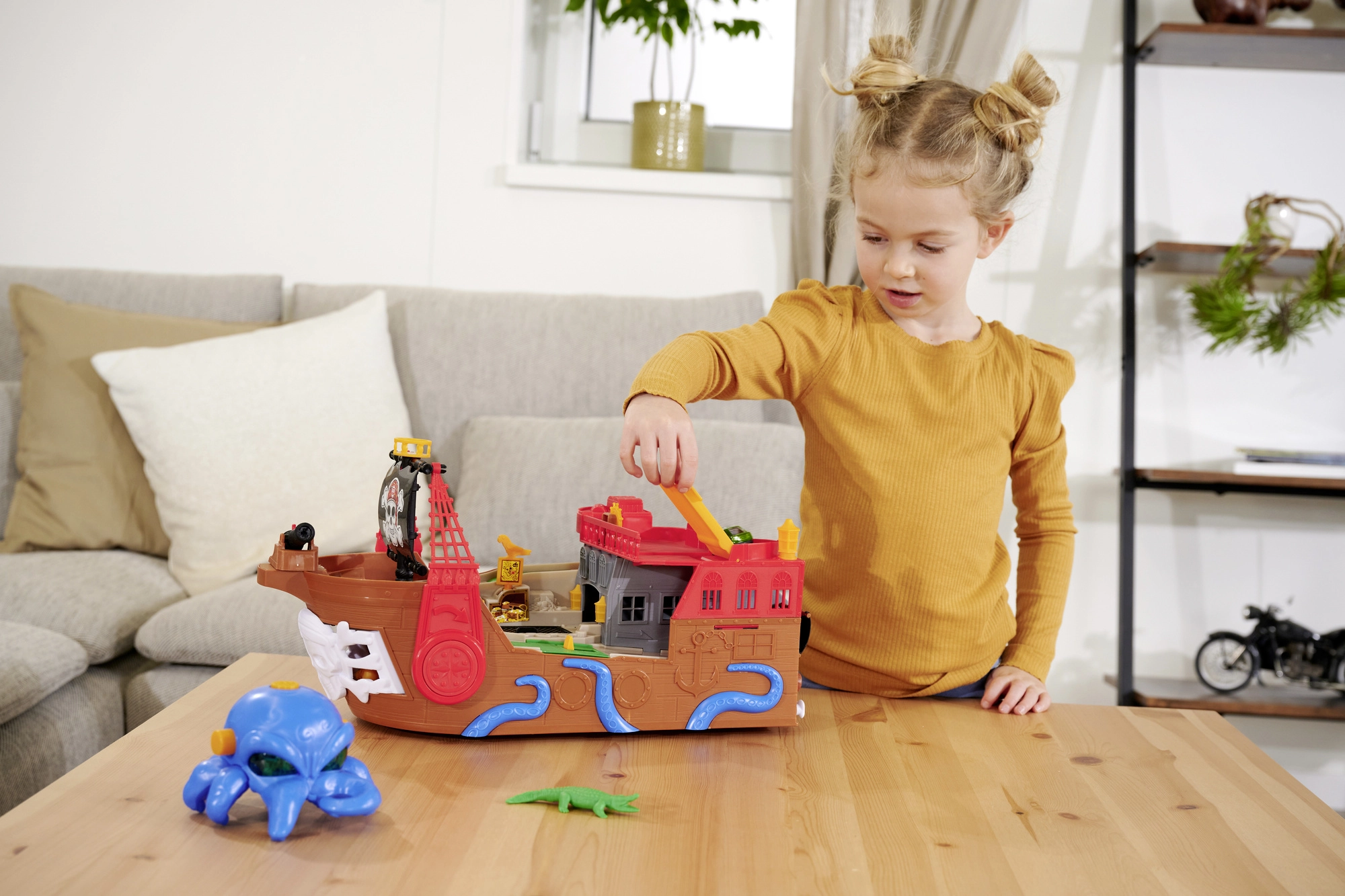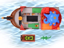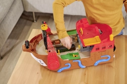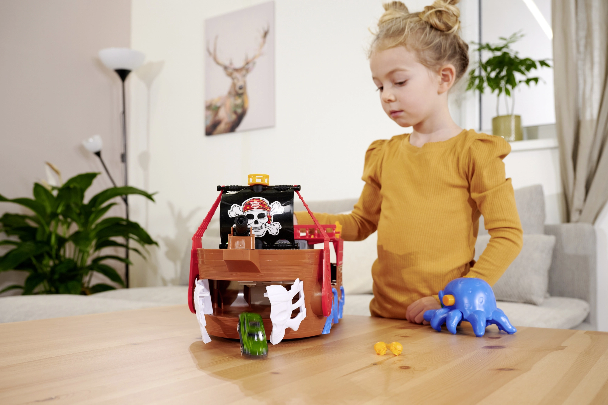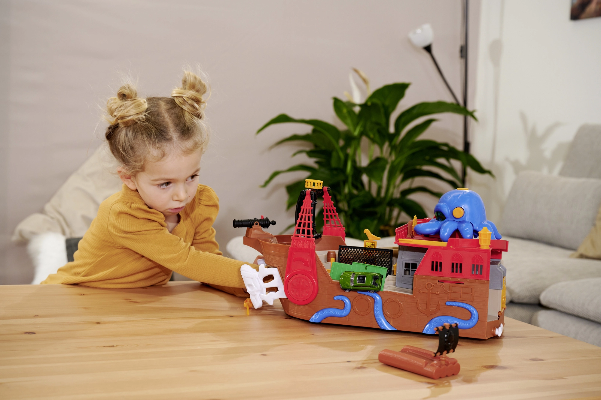 El pulpo desmontable con efectos de luz y sonido ilumina sus ojos y con sus tentáculos “atrapa” el coche u otras piezas, ideal para historias piratas dramáticas. El barco y la balsa flotan en el agua, por lo que son perfectos para la bañera, la piscina o la zona de chapoteo. Después del baño, la acción continúa en la alfombra gracias a las funciones interactivas y al deslizamiento fluido del coche.