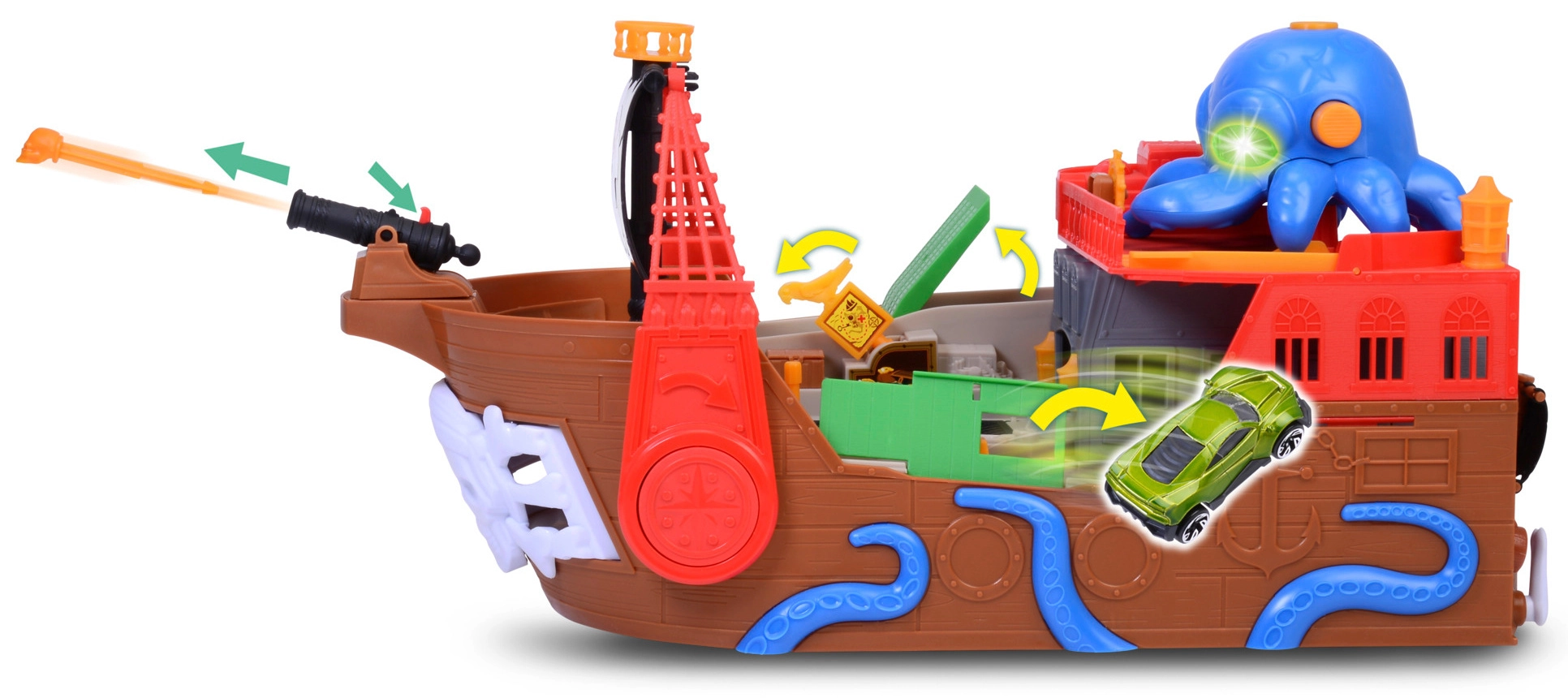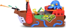 El pulpo desmontable se ilumina y emite sonidos. Con sus tentáculos puede agarrar el coche o accesorios y añadir tensión pirata a las historias.