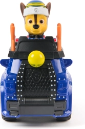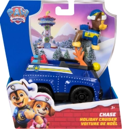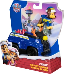 Coche azul detallado con elementos navideños y ruedas móviles. La figura de CHASE con gorro de invierno se sienta directamente en la cabina y está lista para la acción.