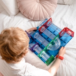 - Set de 92 piezas para crear pistas de canicas y modelos 3D