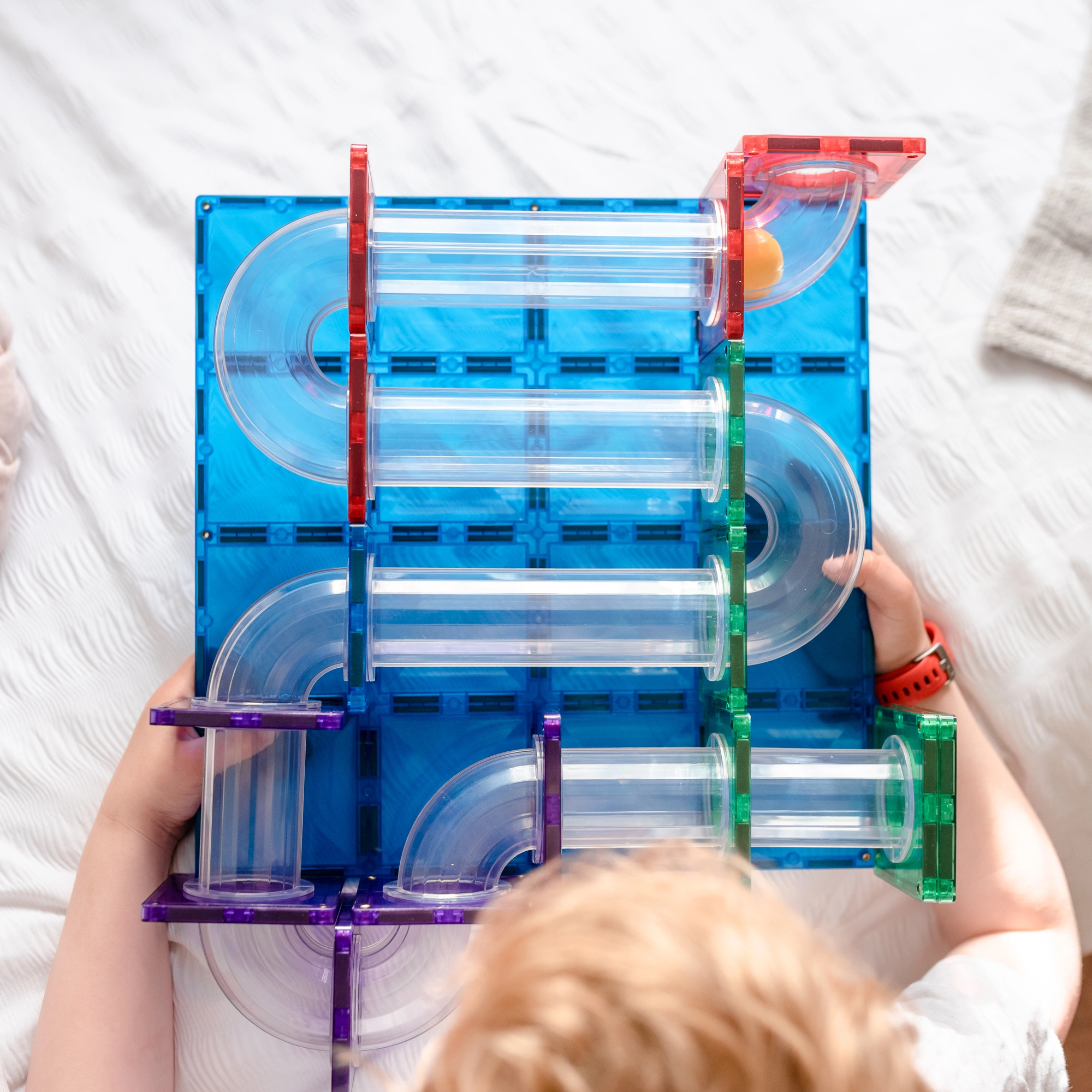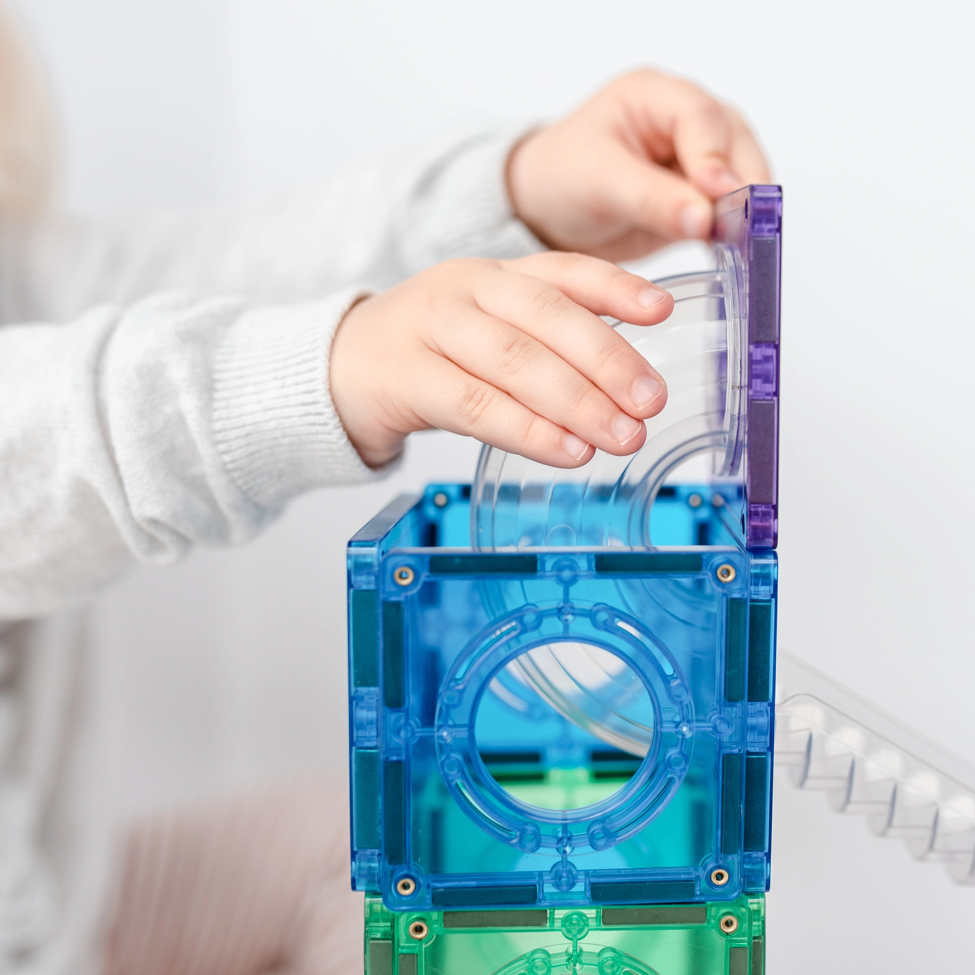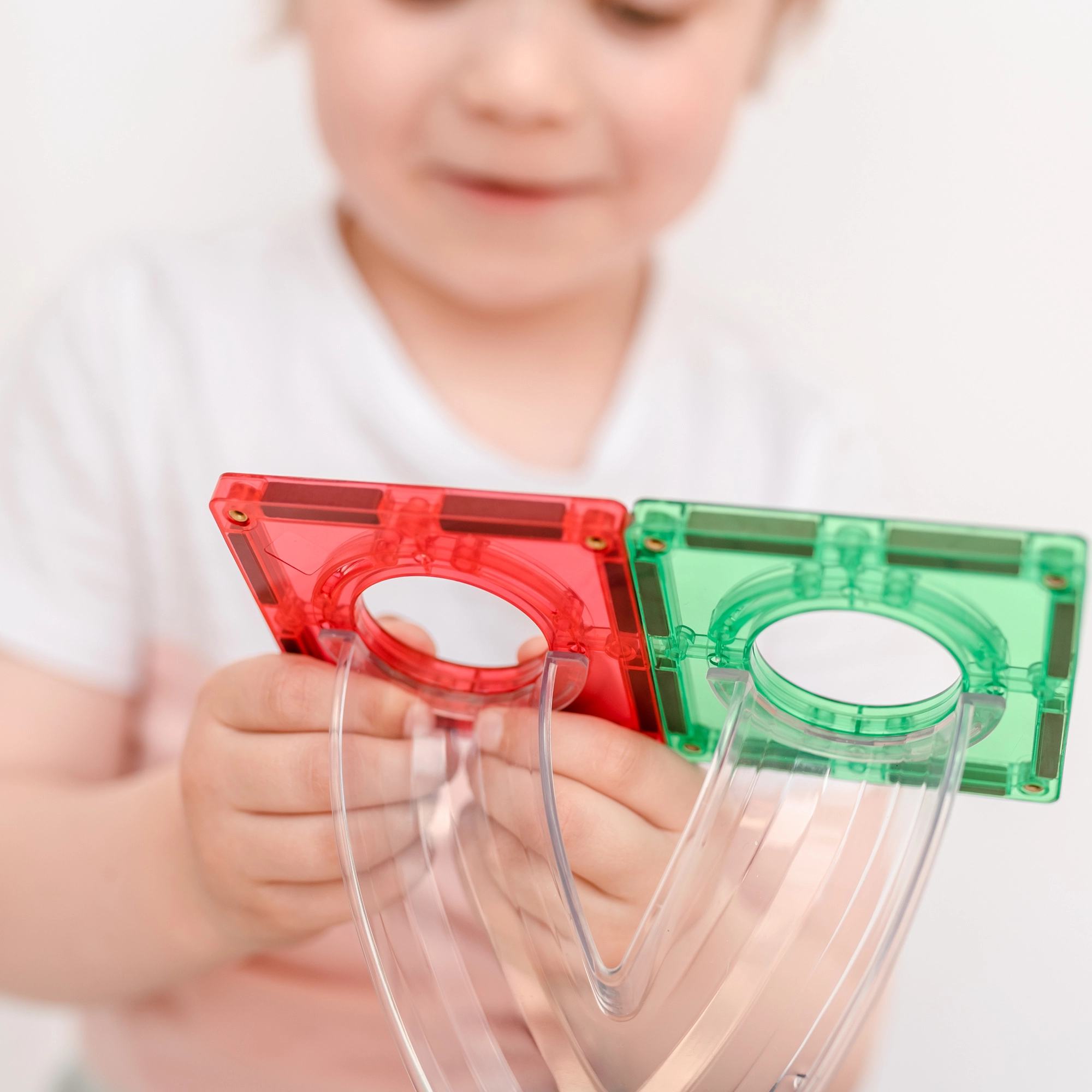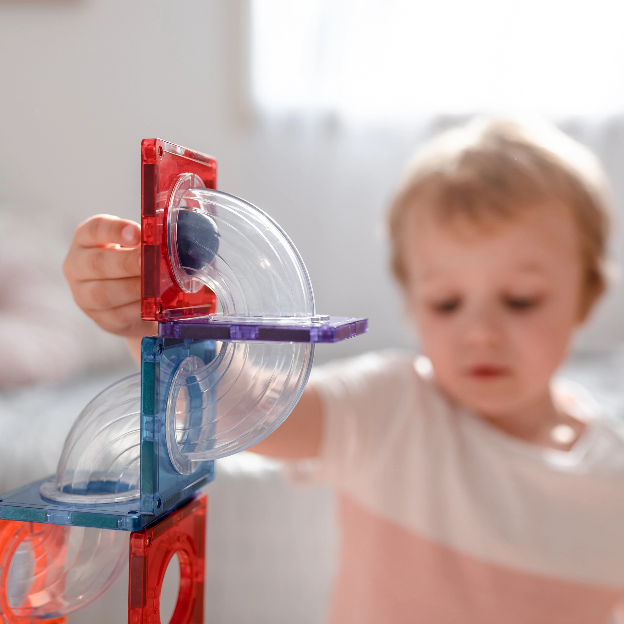 Montad torres coloridas, puentes y pistas de canicas elaboradas, seguid el recorrido de las bolas por túneles transparentes y descubrid los principios de la gravedad, la velocidad y el equilibrio. Las baldosas Connetix en colores arcoíris llevan imanes firmemente remachados que se atraen por todos los lados, por lo que las construcciones se mantienen estables y el “clic” al conectar es sumamente satisfactorio.