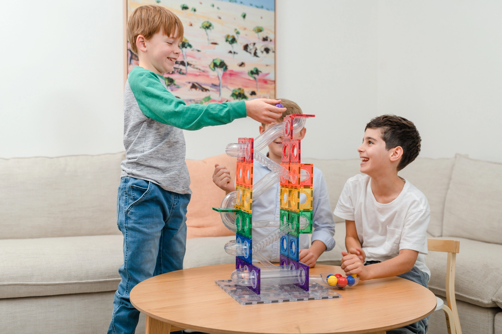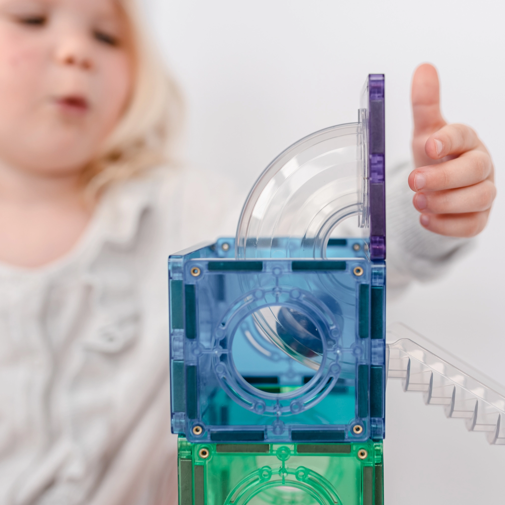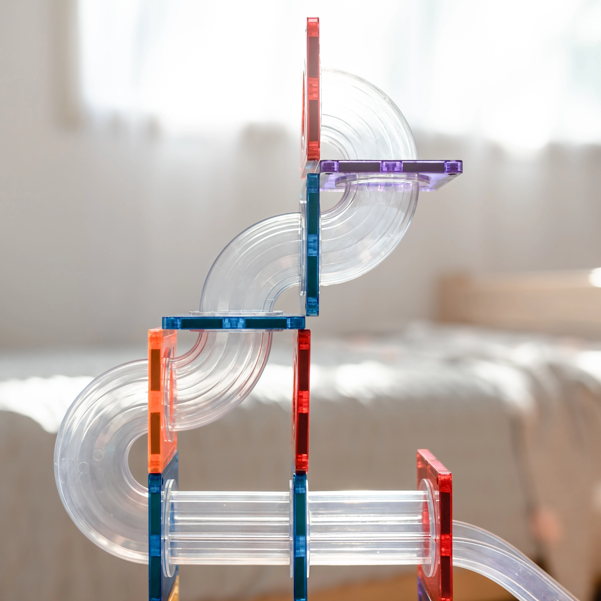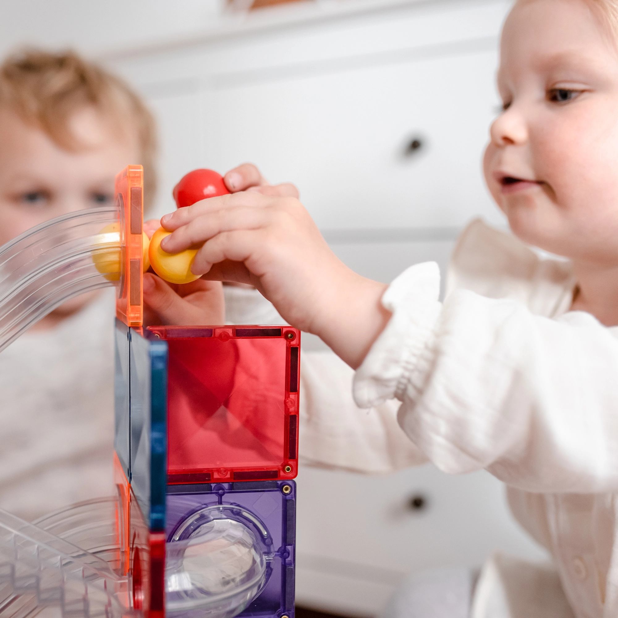 Montad torres coloridas, puentes y pistas de canicas elaboradas, seguid el recorrido de las bolas por túneles transparentes y descubrid los principios de la gravedad, la velocidad y el equilibrio. Las baldosas Connetix en colores arcoíris llevan imanes firmemente remachados que se atraen por todos los lados, por lo que las construcciones se mantienen estables y el “clic” al conectar es sumamente satisfactorio.