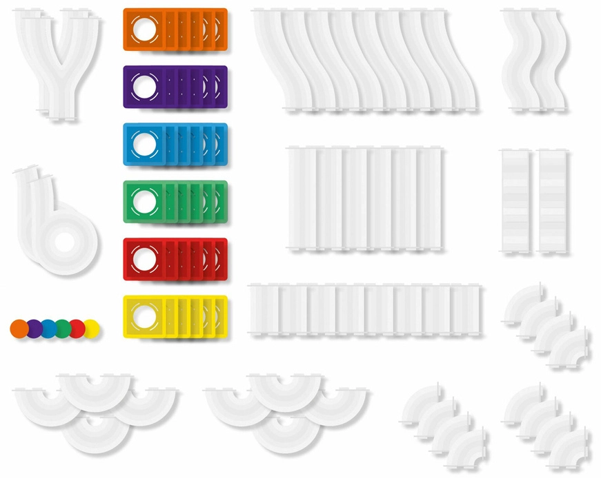 - 36 cuadrados conectores, 6 canicas de madera, 2 divisores en forma de Y, 2 escaleras largas, 2 tubos en forma de S, 8 tubos en U, 8 tubos deslizantes, 12 tubos angulares, 6 tubos rectos largos, 8 tubos rectos cortos, 2 cuencos, folleto ilustrado con ideas