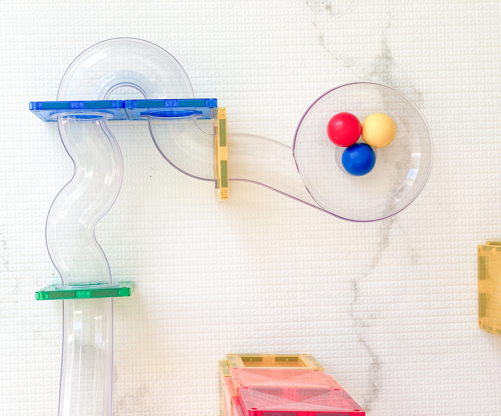 Los tubos claros, curvas, eses y uniones en Y permiten observar el movimiento de las canicas y explorar la velocidad, la gravedad y la causa-efecto con distintas configuraciones.