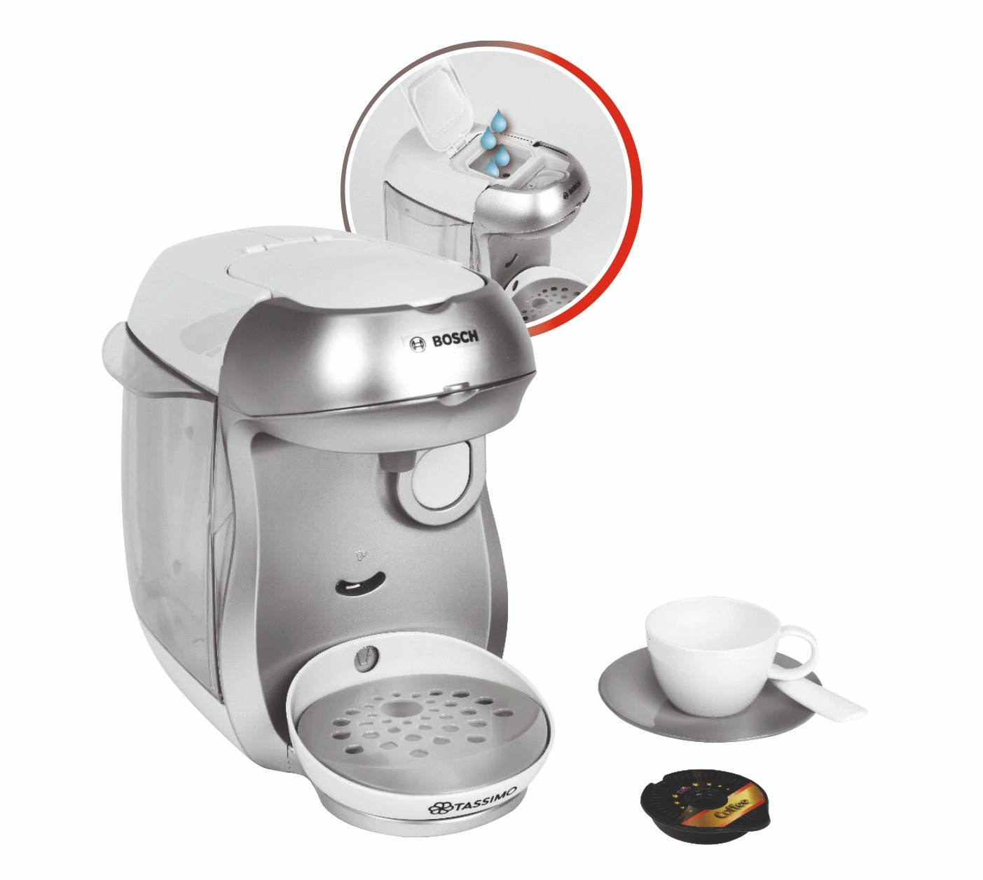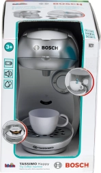 La cafetera infantil TASSIMO BOSCH en color blanco y plateado reproduce fielmente un aparato real, pero es totalmente segura para niños. Solo hay que verter agua en el depósito, colocar una cápsula bajo la tapa superior y pulsar el gran botón de inicio/parada: la cafetera activará el flujo de agua y añadirá sonidos auténticos para una experiencia de juego aún más realista.