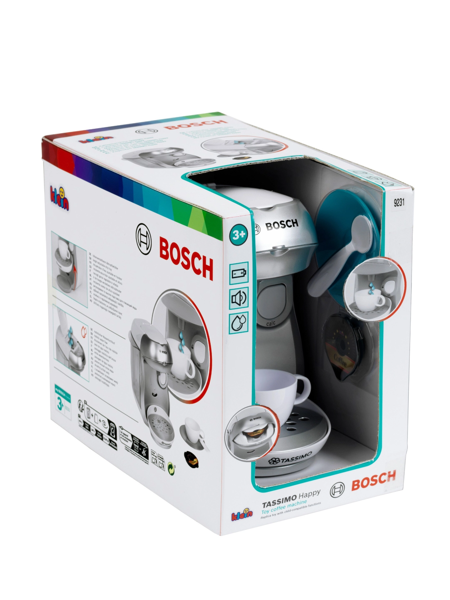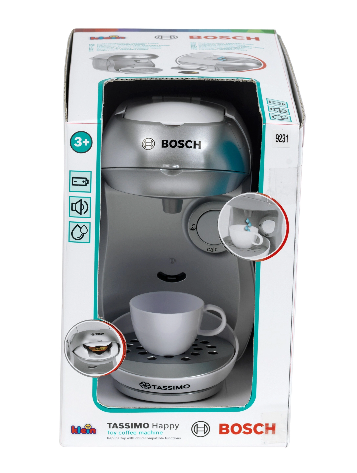 La cafetera infantil realista TASSIMO BOSCH de la marca Klein encantará a los pequeños baristas con funciones auténticas. Cuenta con tapa superior abatible para cápsulas, bandeja recogegotas, verdadero flujo de agua y efectos de sonido que imitan el funcionamiento real. Incluye taza, platillo, cucharita y cápsulas para un juego seguro y creativo.