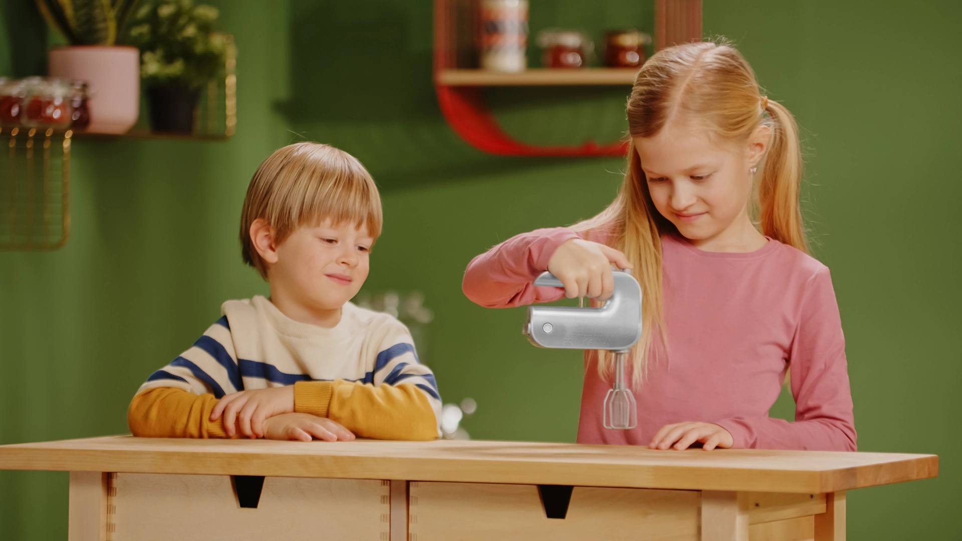 Al presionar el botón, las varillas se ponen en marcha e imitan fielmente el funcionamiento de una batidora de mano real: diversión y autenticidad en uno.