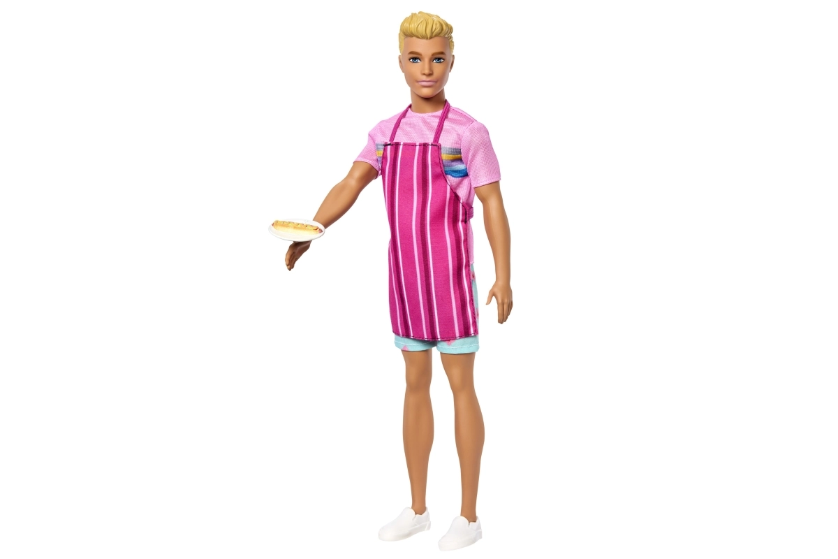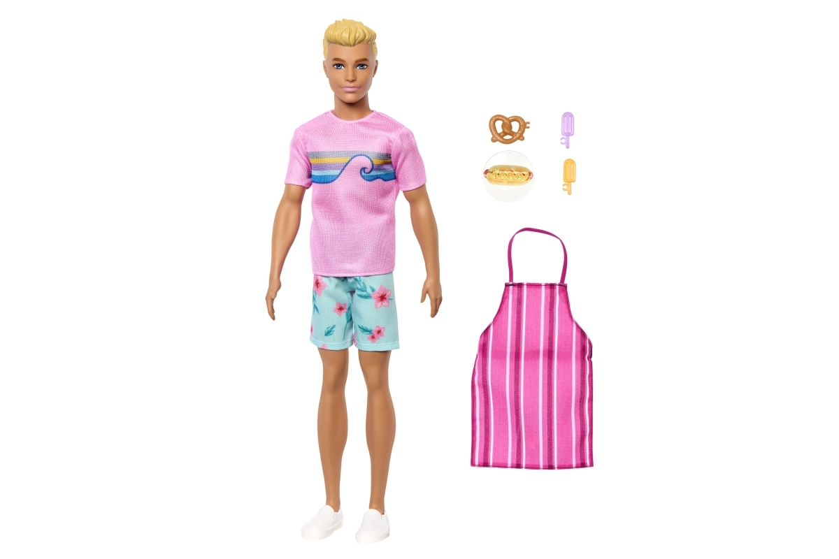 - Muñeco Ken, camiseta rosa, pantalones cortos florales, zapatos blancos, delantal a rayas, pretzel, hot dog, 2× helado
