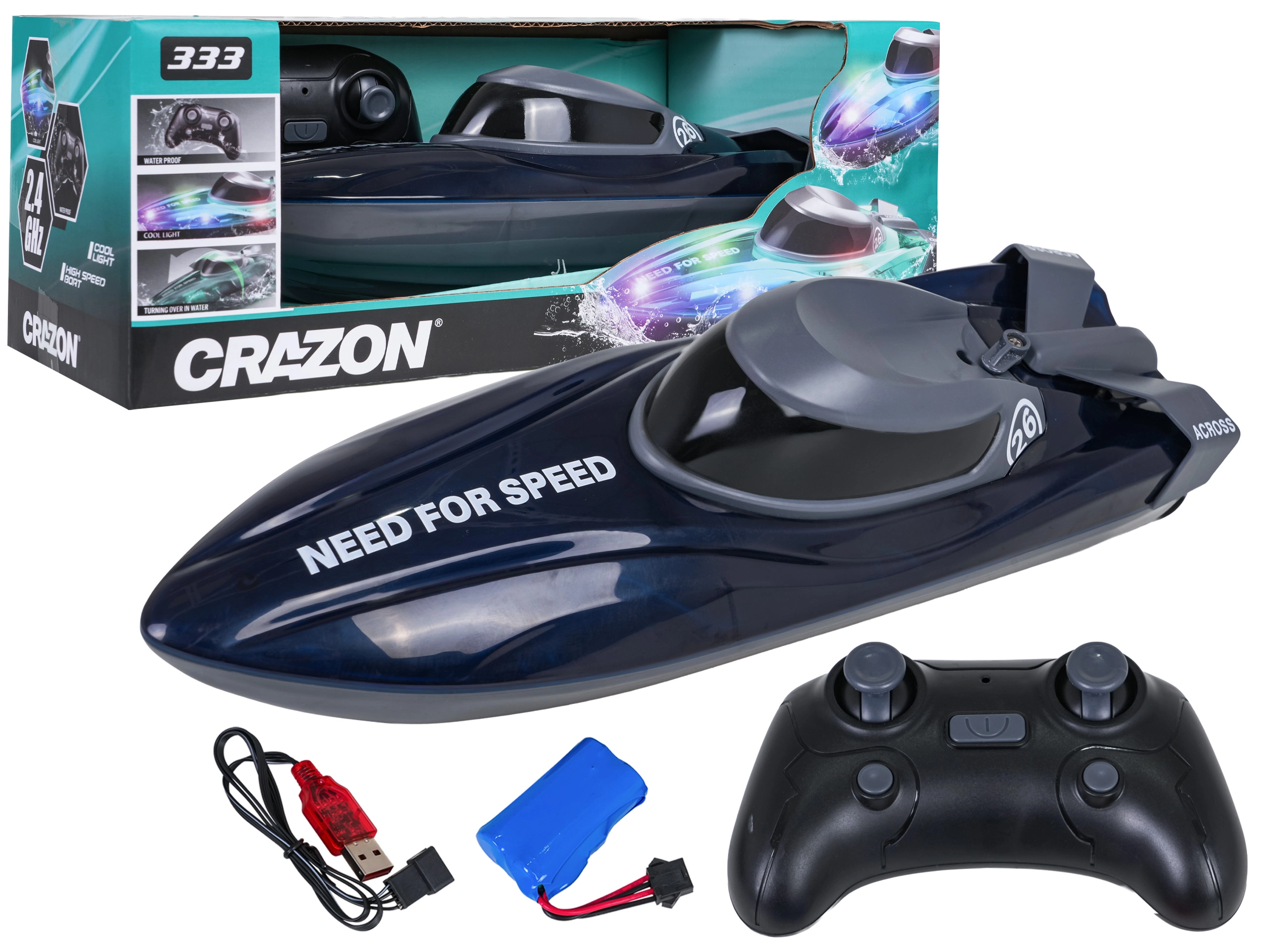 - barco RC con iluminación, batería de 7,4 V, mando 2,4 GHz, cable de carga USB