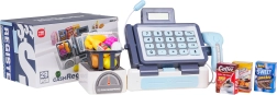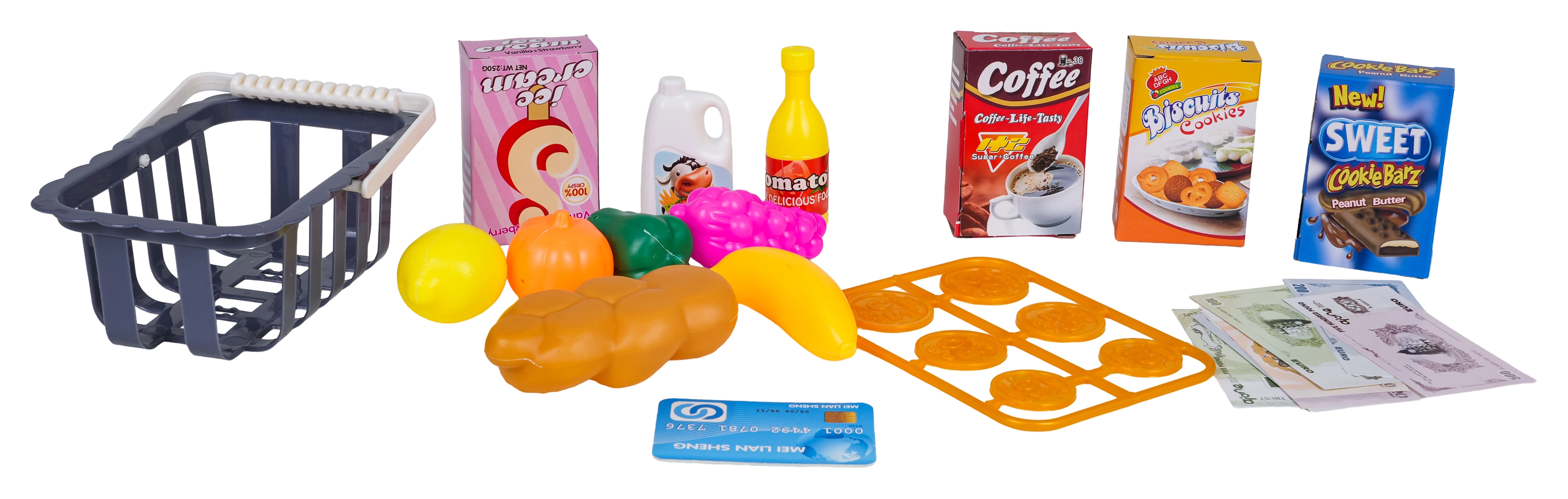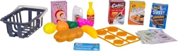 - Caja registradora, cesta de la compra, billetes de euro (5, 10, 20, 50, 100, 200, 500), monedas de euro (2×10, 2×20, 2×50), tarjeta de pago, alimentos de juguete (plátano, uvas, pimiento verde, limón, calabaza, panecillo/chałka, leche, salsa de tomate, 4 cajas: galletas, helado, barrita, café)