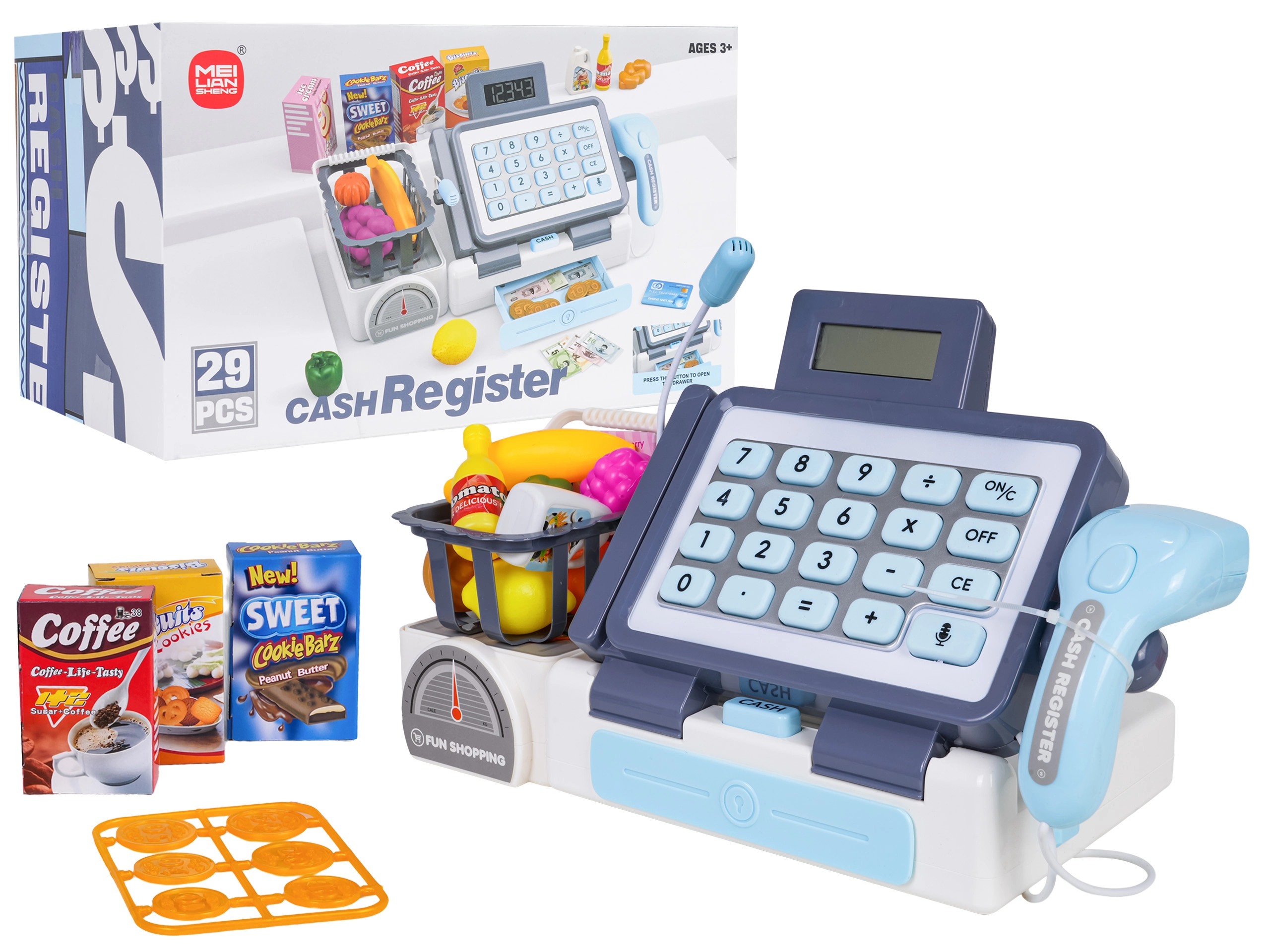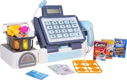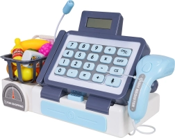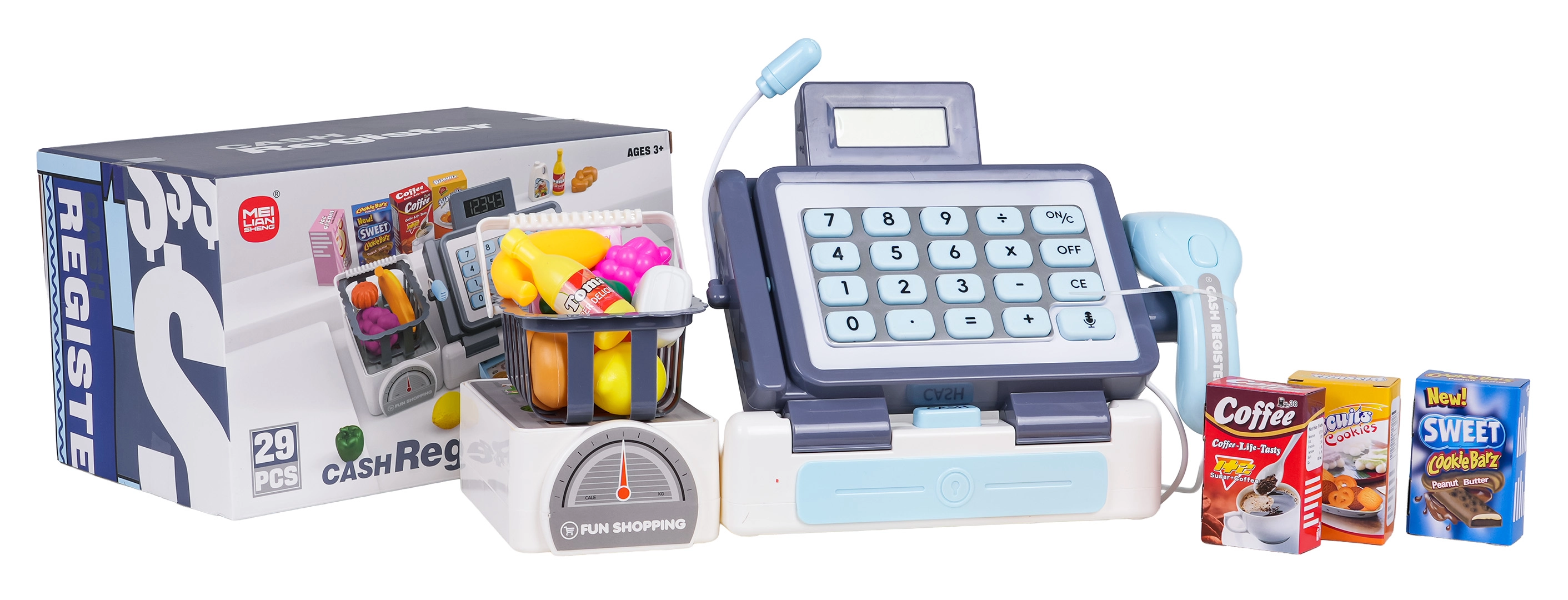 - Calculadora con sonidos, escáner manual con luz y sonido, micrófono, balanza (de imitación), cajón para dinero con apertura